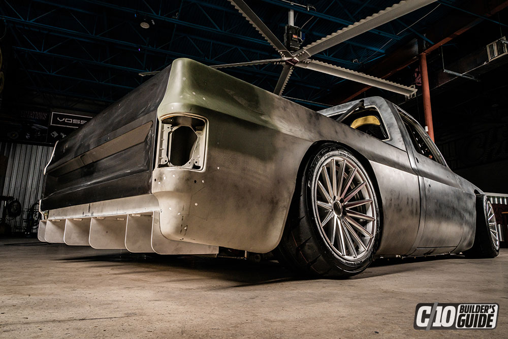 Toyo R888 tires reside at all four corners and protect those amazing 20×12 Finspeed wheels from touching the ground. New body panels from Auto Metal Direct were a no-brainer, but even some of those parts would get the custom treatment as well. The fenders were cut, and an all-carbon fiber wide body is going to be installed. Door handles from a Nissan GTR will be a trick addition, and a big window kit will give it a cool custom detail not many will notice. Finally, to top off all the madness, the truck body will be will be combined from front to back to create one long unibody. We can’t wait to see it!