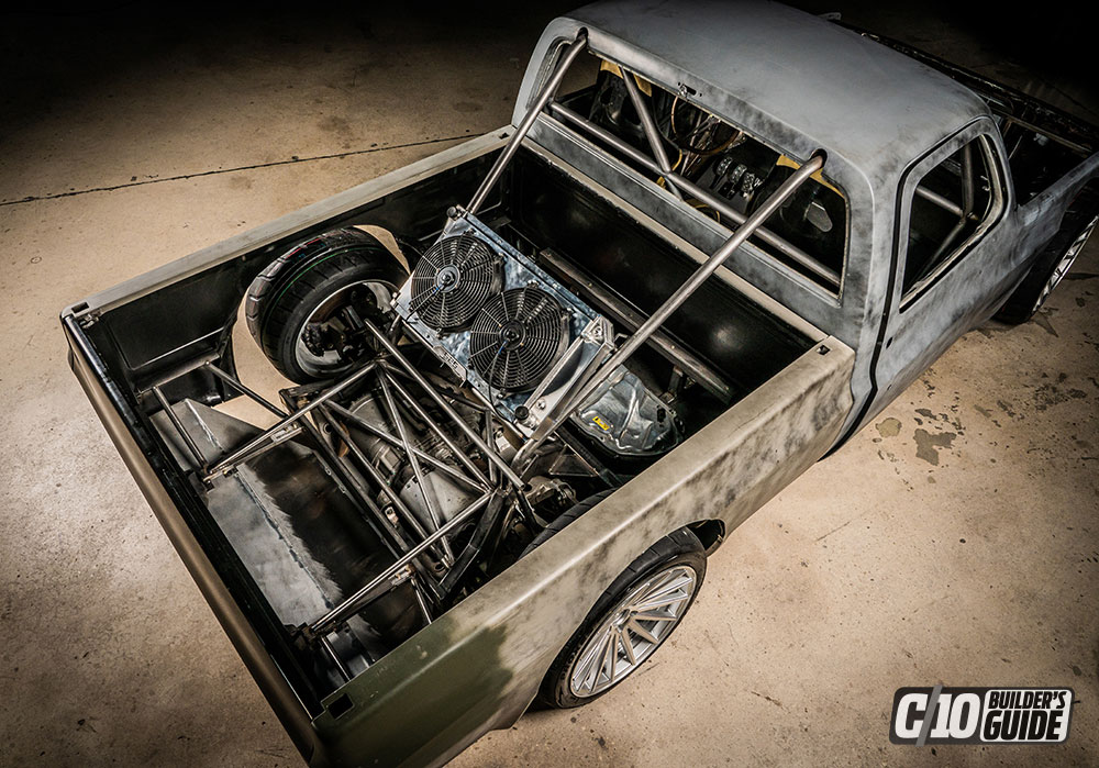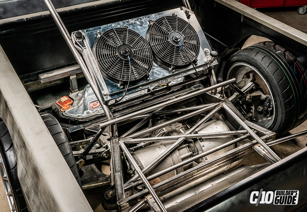 The Tesla motors are from 2017 Model3 vehicles and are the large range units. The original specs for this motor were 220 miles of range, a 0-60 time of 5.6 seconds and a top speed of 130 mph. Now imagine two of those powering an Army Green 1985 Chevy C10 truck. It’s going to be wild! The truck will need multiple coolant radiators and fans from Mishimoto to keep temperatures in check, and all the fitting and hoses came from Earls and Holley Performance. The chassis wiring harness is from Street Smartwire Power Control. A Tesla gear reduction and custom built 1500-hp half-shafts from the Driveshaft Shop transfers the power to the wheels. Wilwood front brakes and Tesla rear brakes bring the truck to a stop along with a Tesla master cylinder. All this technology and engineering can’t go onto that old Chevy frame, so the Salvage to Savage crew built an all-new chassis with a 117-inch wheelbase. The suspension components are comprised of parts from a C6 Corvette, Tesla Model3 along with springs from Belltech Suspension.