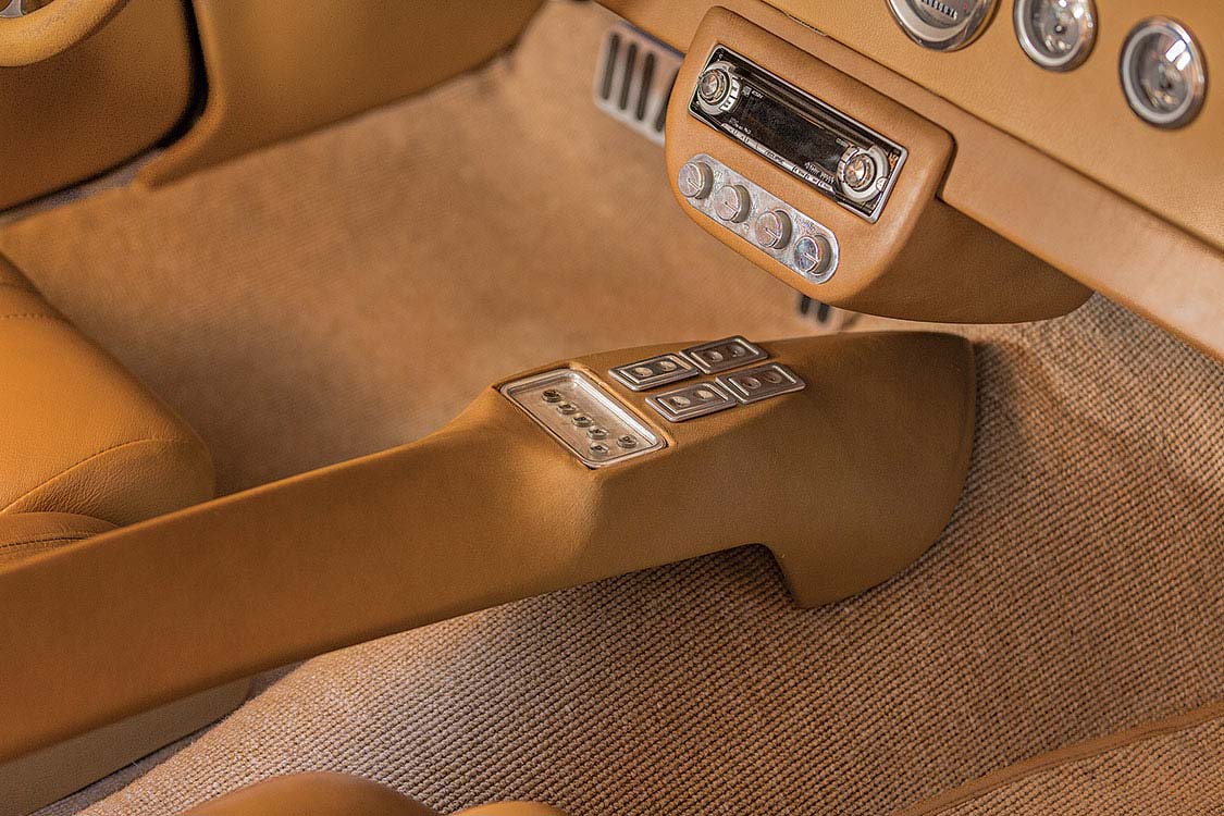 With a modern pro-touring suspension, and a pure performance muscle engine, the interior reflects street rod styling and unadulterated luxury. Since the car was a bare slate, Pin opted to go the custom route and enlisted help from Todd Jubert of The Interior Shop and Aaron Ruddy. A custom-formed dashboard was outfitted with Classic Instruments gauges. The dash flows into custom door panels and a floating center console that houses a Mooneyes pushbutton shifter. A set of four Glide Engineering bucket seats was installed, and everything was wrapped in a total of 13 hides of tan Bentley leather. An ididit steering column with a matching Budnik Revolver steering wheel finishes off the dash. Staying true to the theme of the other components, all of the billet items were brushed. Inside, a Rockford Fosgate sound system is allowed to pound, thanks to Dynamat sound deadener installed throughout.