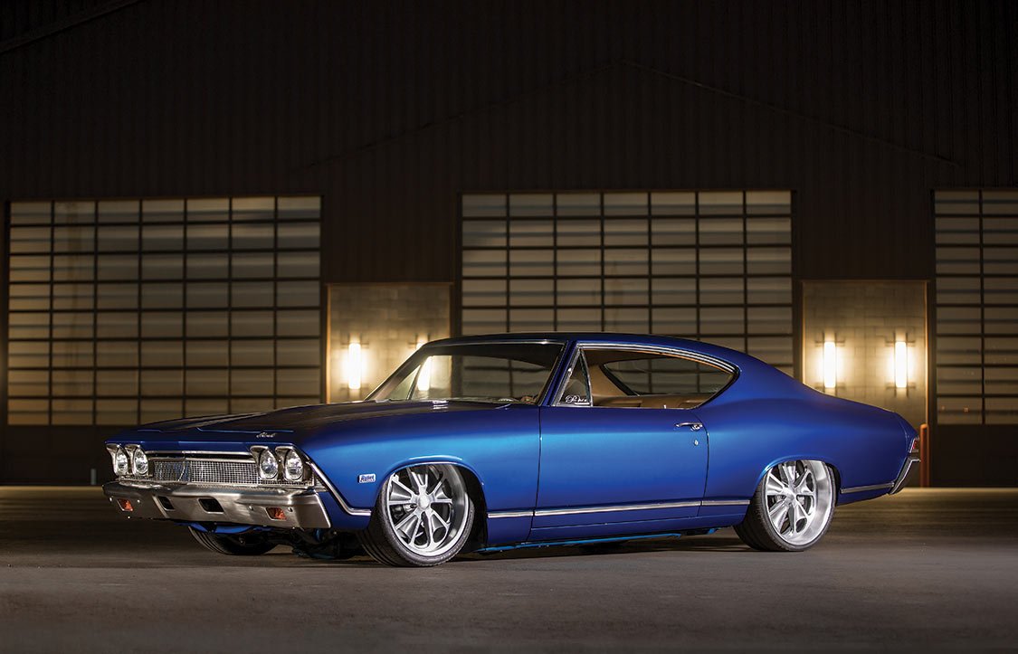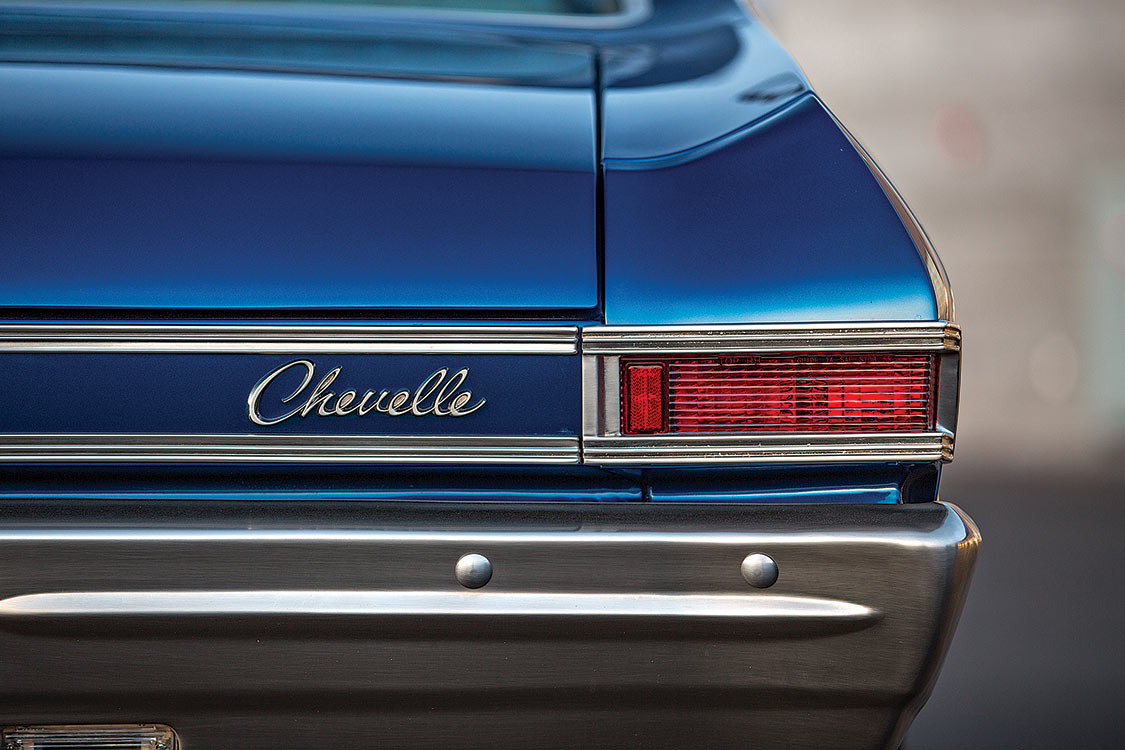 The outside of the car shows a lot of class and a hint of attitude, but pop the hood and you’ll reveal a true monster. A Turn Key Engine 740-hp Kenne Bell supercharged LS2 was dropped in to provide a massive amount of power and modern reliability. To cool down the engine on hot Phoenix days (and let’s face it, nights, too), a Ron Davis radiator and a custom intercooler were installed. Providing cooling for the Chevelle’s occupants is a full Vintage Air Gen IV A/C unit complete with Front Runner accessory drive. Every wire was hidden, and anything that could be was plated in brushed nickel. A TCI six-speed automatic transmission backs up the powerful modern engine and once the pedal is pushed to the floor, a custom-tuned stainless exhaust system from Magnaflow expels spent gasses.