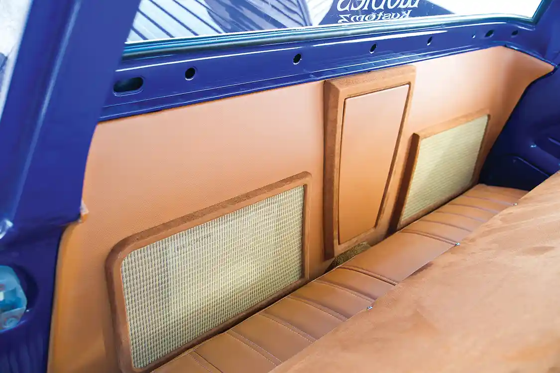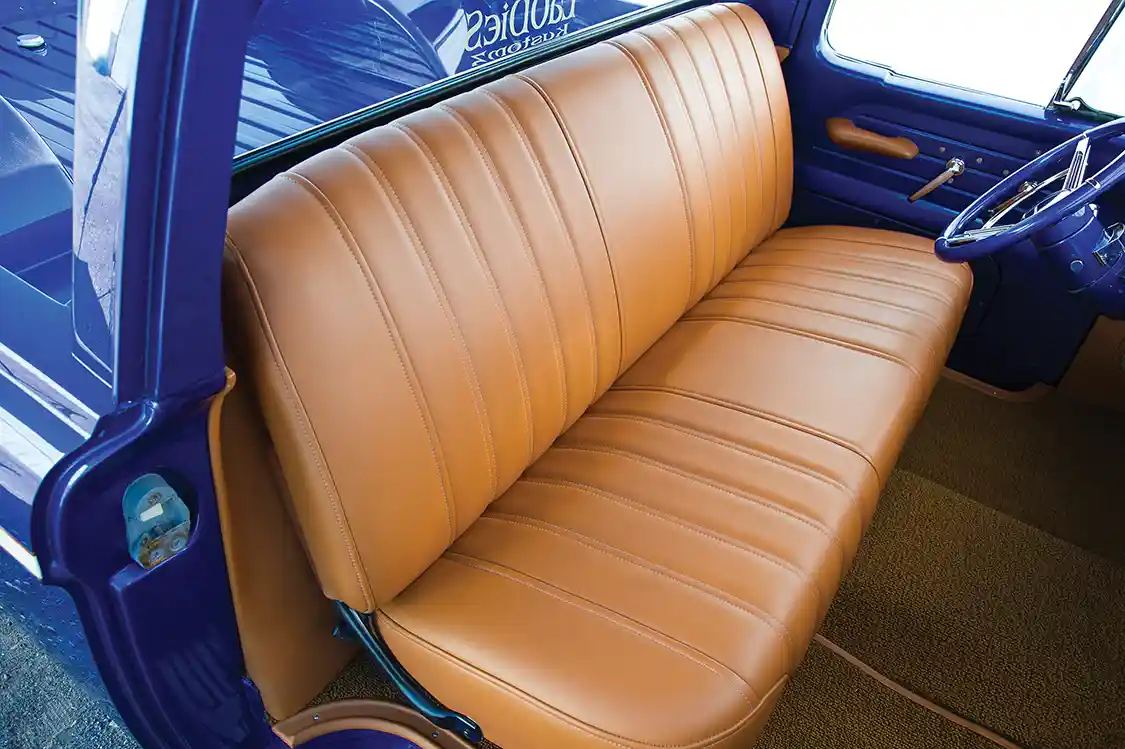 Completing this extra classy build is a clean and simple interior by Specialized Stitch Company in Champagne, Illinois. Ross Johns, Nate Quinlin and Bill Byrd stuffed the cab with style, sewing brown leather and suede over the factory bench seat, custom headliner, kick panels and rear audio enclosure panel behind the seat. Mercedes wool loop carpet was tacked to the floorboards. The brown leather and suede and custom panel work are the perfect complements to the painted dash and steel door panels, which are further accented by a Con2R steering wheel, Dakota Digital VHX gauges and Vintage Air climate control vents and knobs.