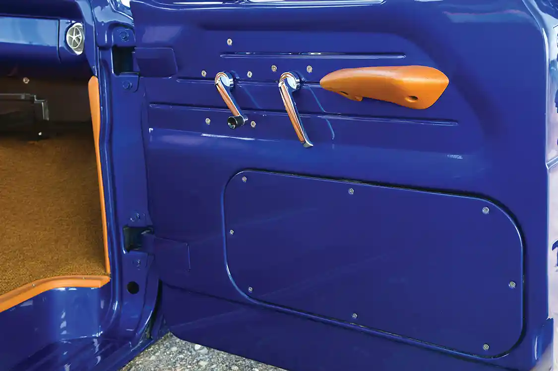 After the chassis, suspension and drivetrain mods were complete Adam shifted his focus to the body of the old farm truck and delivered all of the sheet metal to Michael Lee at Mykal’s Custom Auto & Paint in Fairfield, Illinois. Michael spent the better part of five months repairing the truck’s 54 years worth of battle scars, gapping the body panels to perfection and smoothing the old Ford from grille to tailgate. Creating custom tailgate hinges and custom-capping and extending the rocker panels are just a few of the tricks Michael did to chisel this classic Ford’s envelope into shape. Following the trick metal work, detailed bodywork and extended block-sanding session, Michael mixed up custom blue paint and laid down a true show finish topped with a custom cream stripe to accent the distinctive factory unibody lines. Variegated gold leaf breaks up the stripe nicely, adding extra dimension to the graphics. Following the paint, graphics and clearcoat, the truck was color-sanded, polished and reassembled with fresh chrome trimmings and glass.