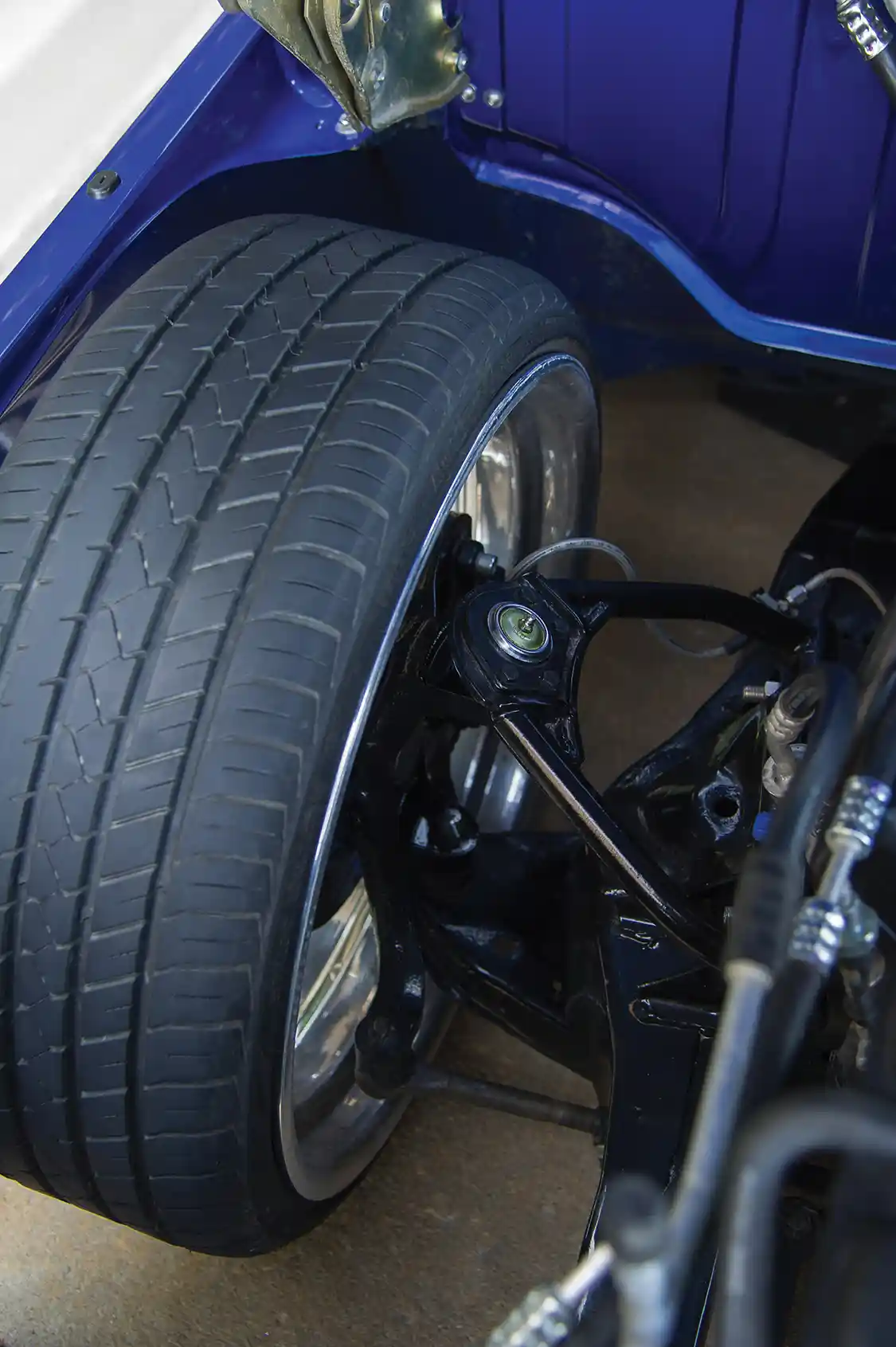 Backing up all of this pavement-crushing style is a modern Blue Oval bullet under the hood that replaces the feeble original Y-block. The drivetrain in this slick, smooth classic was pulled from a 2008 Ford Crown Victoria Police Interceptor and features a 4.6L mod motor with headers and a 2.5-inch Flowmaster stainless exhaust system tipped with Flowmaster stainless 40 series mufflers. A custom 3-inch cold air intake system feeds the beast, while a Ford AOD transmission transfers the power down the line. Von sorted out the factory engine/transmission wiring harness and connected all of the electrical dots to get the old bad guy chaser to run in its new position of power in the truck. Custom engine and transmission mounts were also built to hold this modern fuel- injected tire-burner firmly in place when Adam buries the fun pedal. A Tanks, Inc. custom fuel tank was mounted in the rear of the frame underneath the bed to hold cruising ammunition.