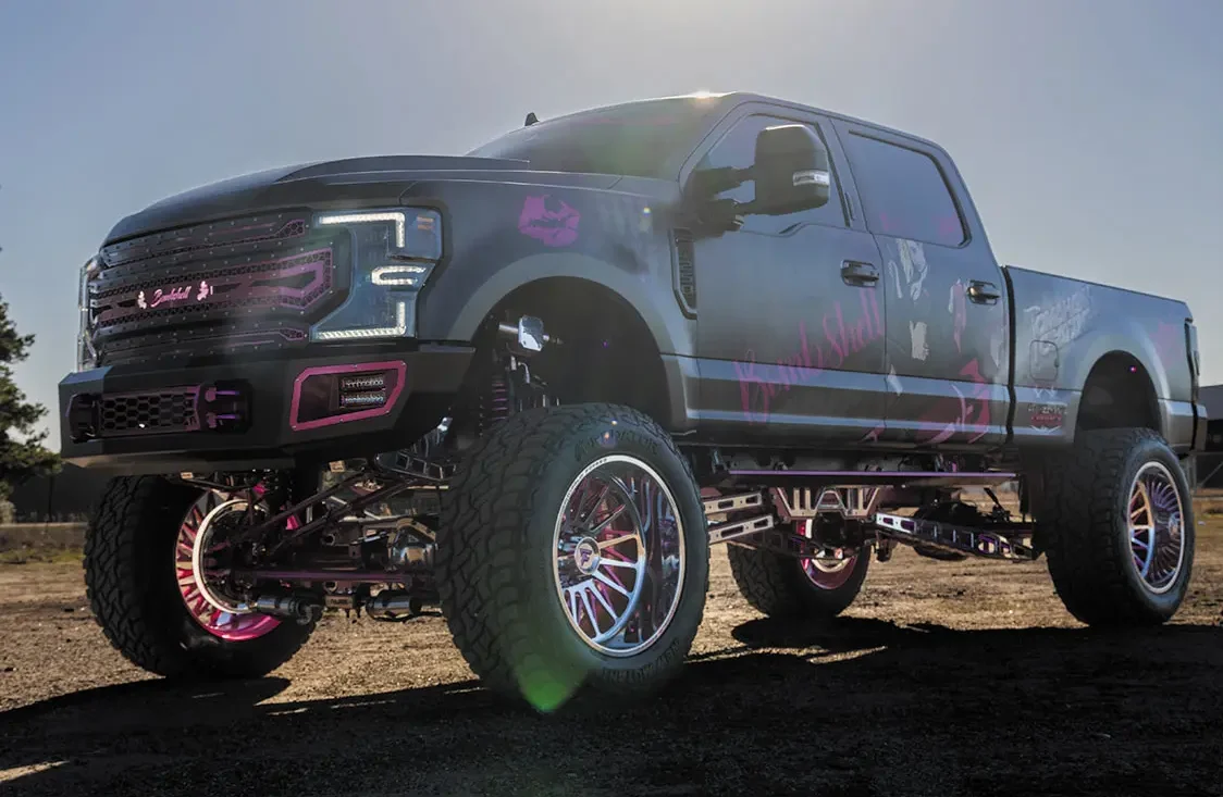 You can’t have a custom F-250 without somehow altering the suspension, of which Amber had high hopes for in regards to her dream build. That’s why she chose a full Papis Super Duty 10-inch to 12-inch long arm cradle lift kit with a dual steering stabilizer. This massive lift not only gave Bombshell extra height, but it also added additional components to carry the gray and pink color scheme. Even the Carbon Shock Technologies coilover shocks were treated to the same Malibu Barbie Pink hue seen throughout the truck.