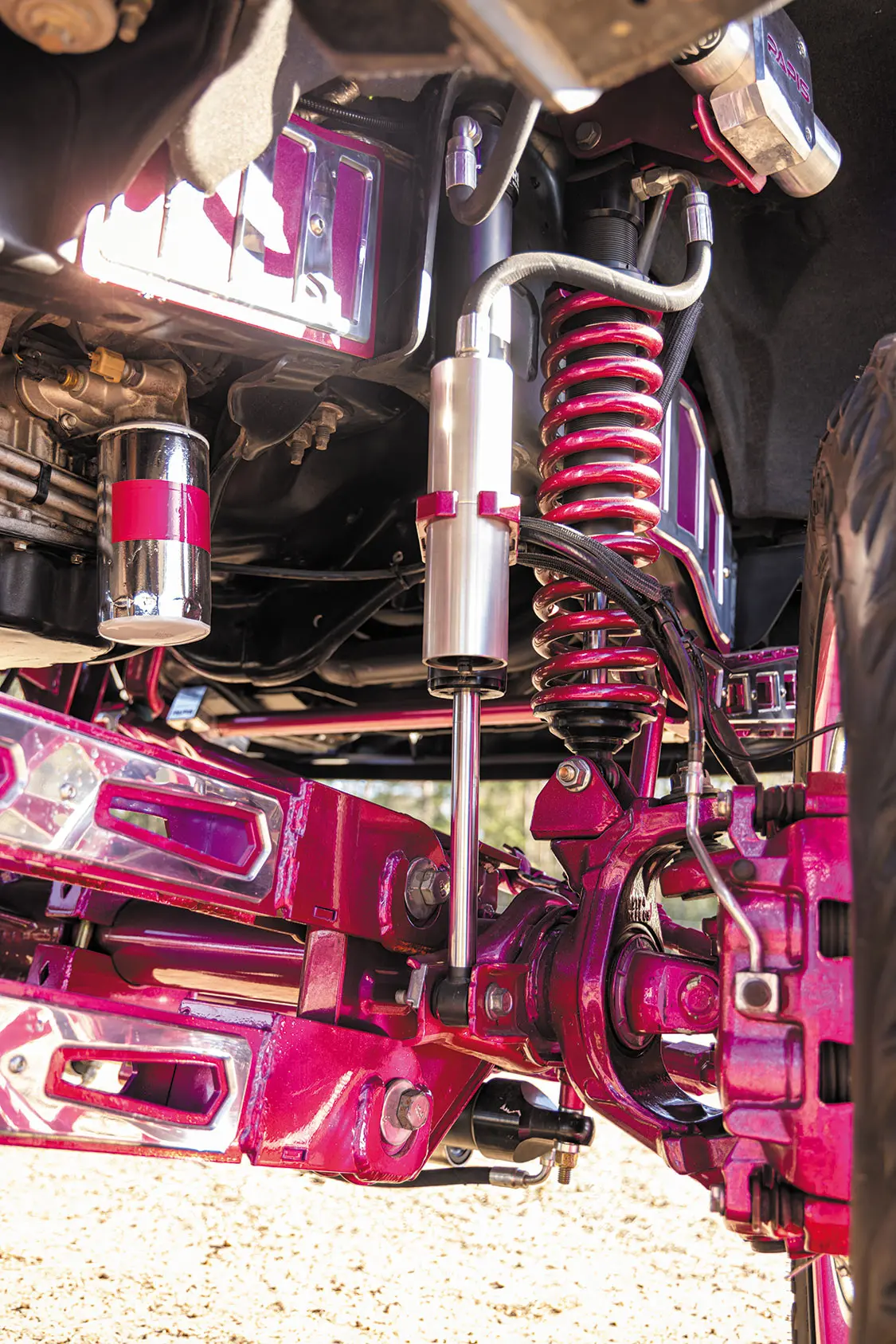 Making the truck stand out even more are Malibu Barbie Pink powdercoated accents, from the grille inserts to the Gen-Y Mega-Duty 10K drop hitch, all done by Amber and Tomahawk Coating in Apache Junction, Arizona. Amber was fully immersed even in the powdercoating process—a skill she was taught by the crew at Tomahawk Coating.