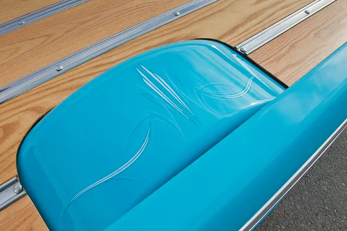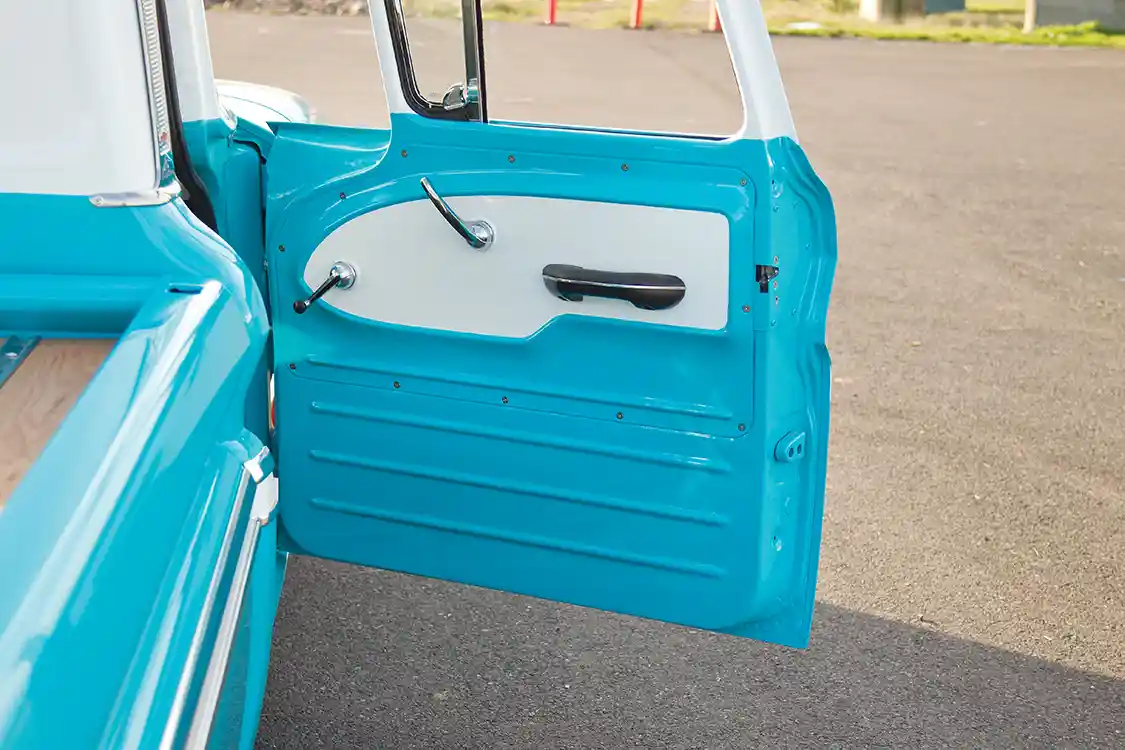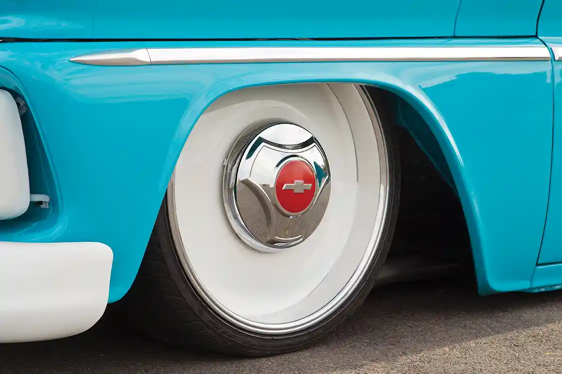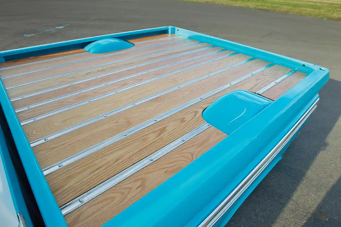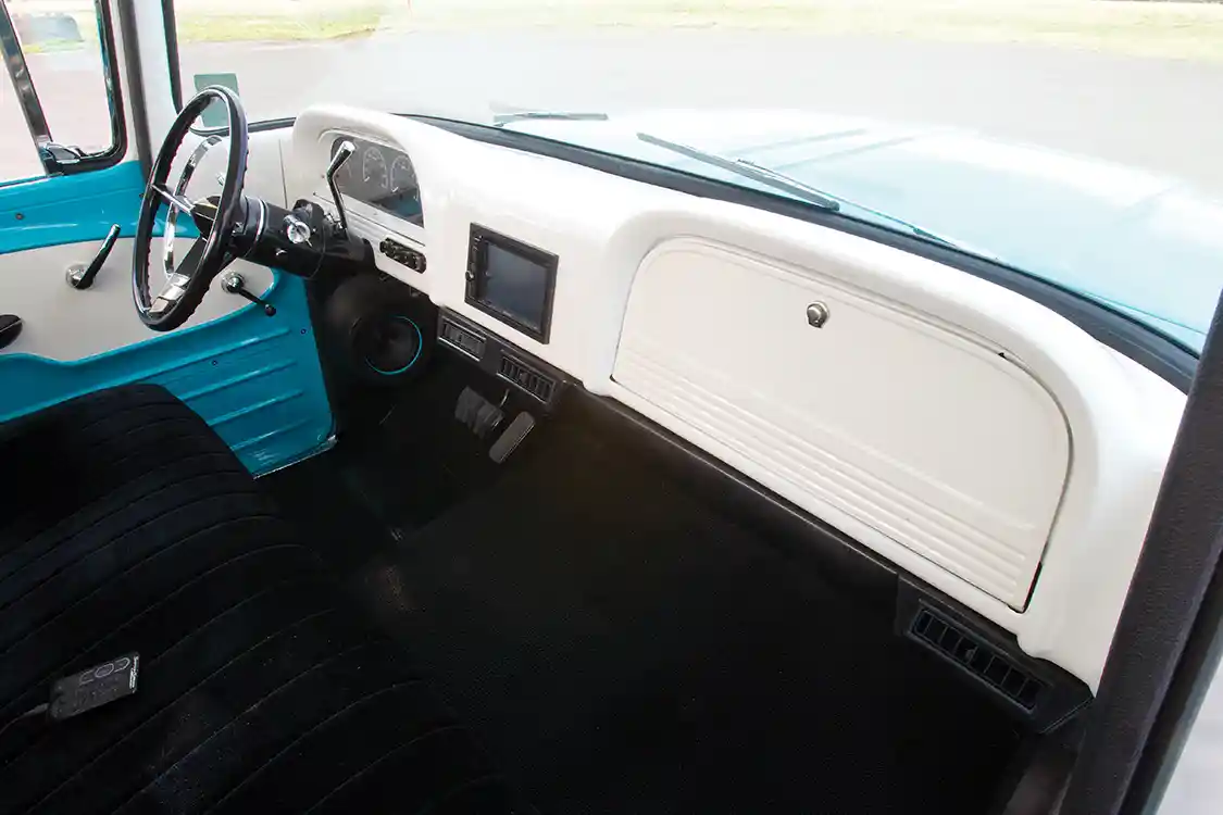 But hey, at least he spared his buddy Cody at Scotti’s Upholstery some grief by running all of the AccuAir wiring first, and having the folks at Stereo King plan the Kenwood-based system before letting him loose on the interior. Using a 1988-98 C/K bench as the centerpiece, the seating was wrapped with a factory-style pattern in suede and leather for a classy, understated look. A Flaming River column topped with a 1955 Bel-Air-style wheel sitting in front of a Dakota Digital VHX gauge cluster and Lokar pedals completes the interior.