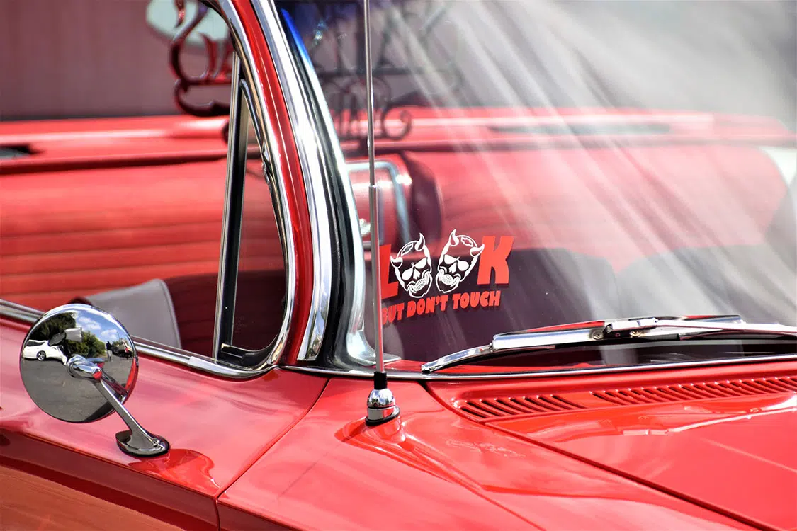 Robert tells us the car’s color is House Of Kolor Royal Red, hence the title of this story and he spends considerable time keeping this red beauty looking spiffy. We can attest to that. As we were prepping for the photoshoot, Robert was wiping down the red Bubbletop to perfection. Good job Robert!