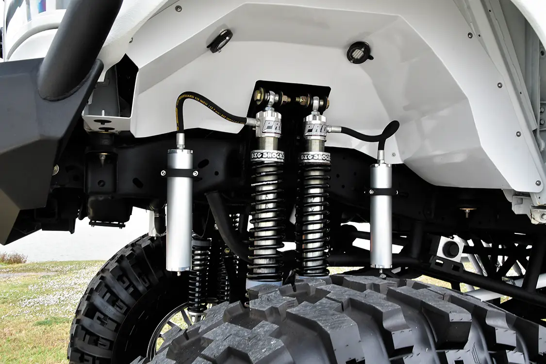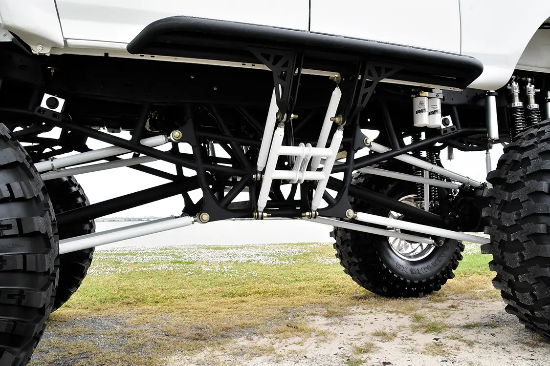 PCW Fabrication soon added a roll cage inside the cab, as well as a mount for the HornBlasters authentic train horn. Southern Lights Unlimited designed a cool lighting package using RGBW rock lights and 3-foot LED whip lights. The toolbox in the bed holds three XS Power batteries, an 8-gallon air tank for the horn, and the truck’s unique hydraulic system. Once all the body parts were in place, Goose partnered with Patriot Liner to have the entire body sprayed with white bed liner.