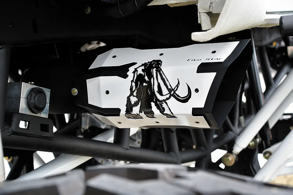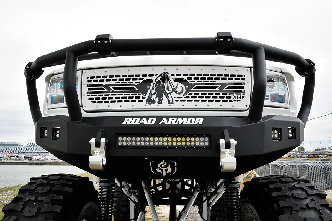 How does anyone get started on a project of this scale? Well, it is every customizer’s goal to be one step ahead since old news does not make headlines. That means new ideas and a careful plan are essential. The plan for this 30-year-old Bronco began with Goose enlisting the help of CCS Designs with ‘bigger and badder’ as the operative words. Once the rendering was complete, the need to source their unique body mods took him to McQueen Prototype Design, where they created the widest possible set of Baja Racing-style fiberglass fenders and a hood. While the original cab, doors, and parts of the bed remain, the body is now augmented with fiberglass fenders that are six inches wider than stock, making the truck 96 inches wide and on the edge of what is road legal. Custom inner fender panels protect the motor and were followed by a series of other unique accessories. A hand-fabricated grille and headlights, custom side mirrors, and maybe one of the more outrageous options, the one-off Stealth Series Intimidator bumper from Road Armor was added to the mix. Laser-scanned and cut to fit the new body, its massive size is perfect should Goose somehow encounter the occasional wandering mastodon!