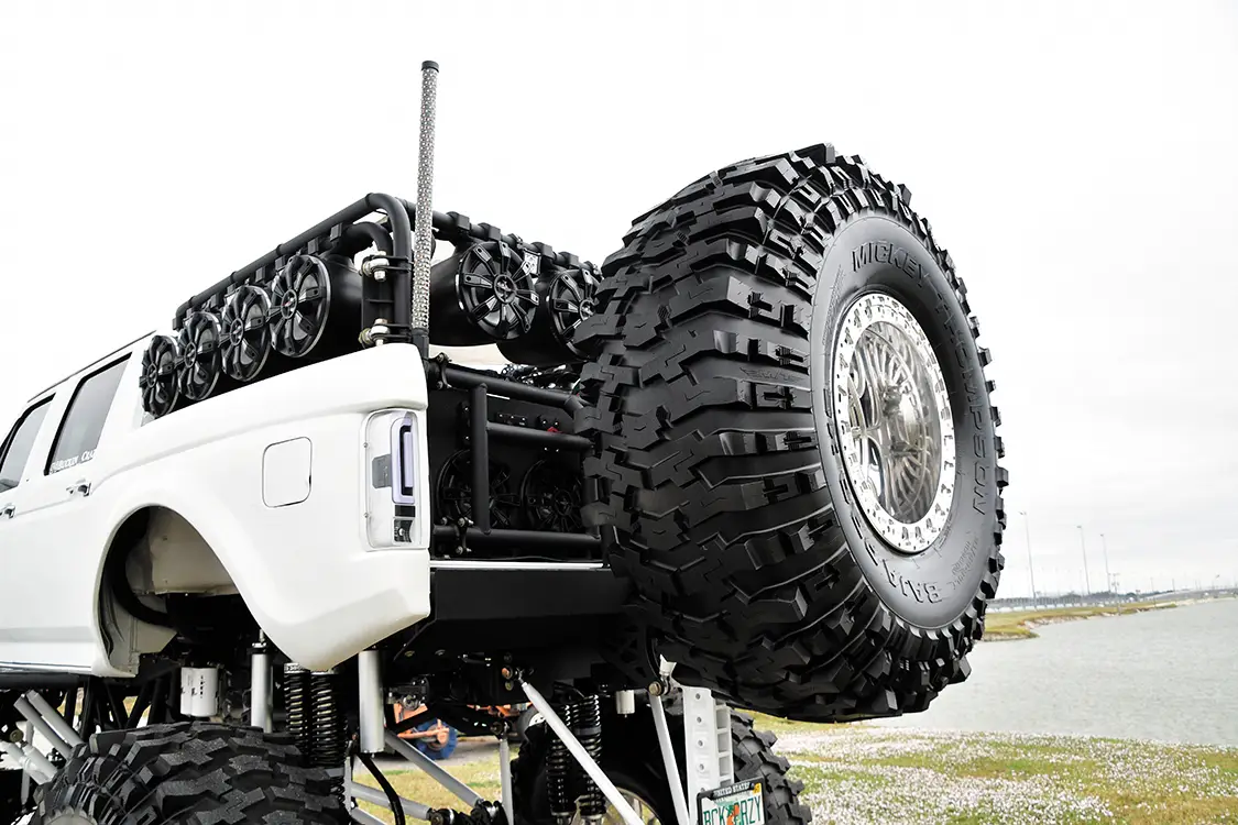 You can’t create a 10-foot-tall rig without some serious suspension work, and one of the most unique parts of the chassis is the Atomic Axles. With only 13 sets ever built, Goose has VIN 001. They provide almost ten inches more ground clearance at the differential than a traditional Dana 60. The rear is equipped with East Coast Gear Supply 5.13 gears and Dutchman Axle CV shafts. The custom 4-link suspension by PCW Fabrication holds the axles in place with help from eight 18-inch Big Shock PRO Series reservoir coilovers. They fill the wheel wells, keep body motions on a short leash, and expertly snub the largest DOT-approved Mickey Thompson Baja Pro XS 21/58-24 tires. Everyone knows that wheels can make or break the look of a vehicle. Luckily, Goose has been part of the Team TIS wheel family for several years, and they secretly worked to create five Buckin’ Behemoth 24×16 polished TIS Forged wheels with simulated beadlock rings. Kap King Co. created the floating center caps with the Buckin’ Behemoth logo.