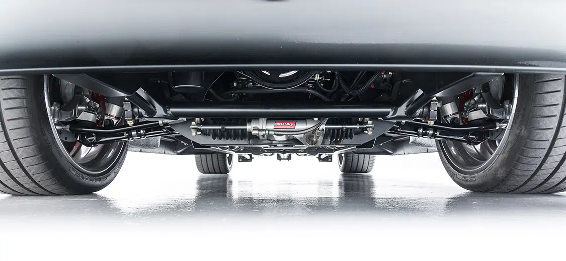 A Chevrolet Performance 6L80E crate transmission with a billet planet custom stall converter and shallow oil pan. There was also an Ultimate Transmission torque converter added and the new trans cooler was mounted under the bed. The custom transmission work was handled by Ultimate Transmission in Garden City, Idaho. Once the power leaves the transmission, it is fed to a Ford 9-inch rear axle from Dutchman Axles in Meridian, Idaho to put the power to the ground.
