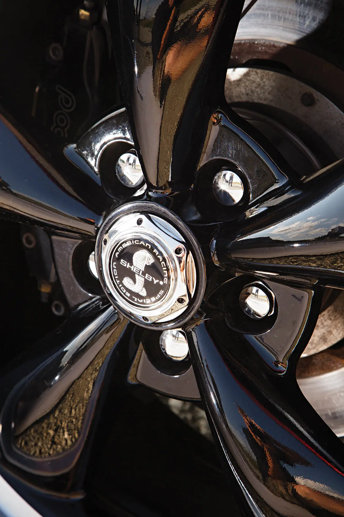 As the Cougar neared completion, the performance potential of its new engine and chassis had Stuart itching to hang it all out on the road course. This required putting together an interior that was both functional for track use, yet comfortable for street driving. As such, he installed a set of Corbeau racing buckets and 4-point harnesses. For the sake of consistency, he covered the rear seats and door panels in matching leather and micro-suede. Since track driving requires keeping a close eye on a car’s vitals, Stuart fabricated a custom center gauge panel that mounts in front of the shifter, and houses the oil pressure, water temperature and volt gauges. While so much focus on track performance might suggest that street comfort isn’t a priority, that’s certainly not the case. He rigged up the factory Cobra a/c system to function seamlessly inside the Cougar’s cabin; he also installed Electric Life power windows. Even the rearview mirror is a modern auto-darkening unit that has an integrated thermometer, compass and map lights.