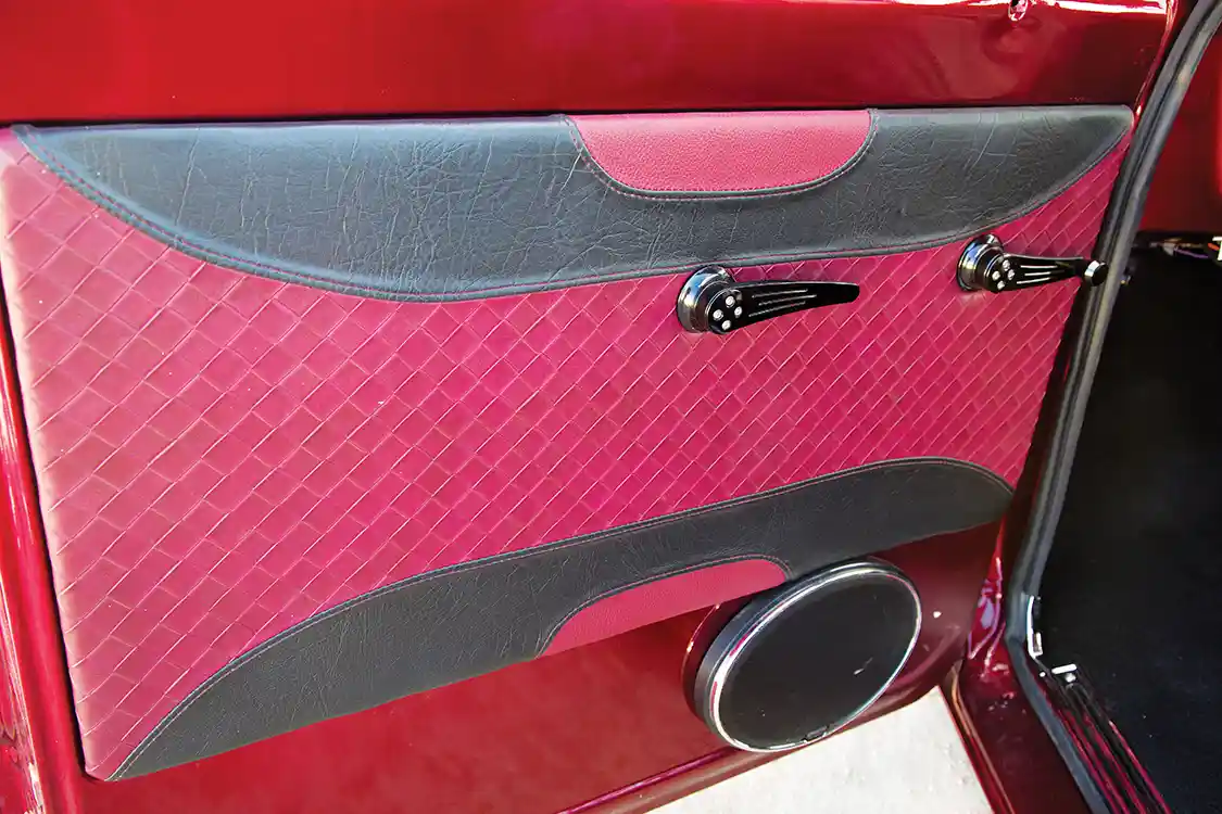 When it came time to revamp the interior, Kevin contacted local Reno favorite Wellman’s Upholstery to create another one of its masterpieces. Black and red leather hides were stitched up to cover the custom bench seat and door panels, and a custom carpet set was made up for the bed. To finalize the inner confines, a set of matching Classic Instruments gauges was installed, which contrasts the cab’s fine details, such as the Eddie Motorsports handles.