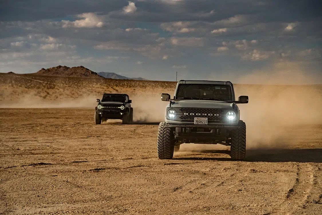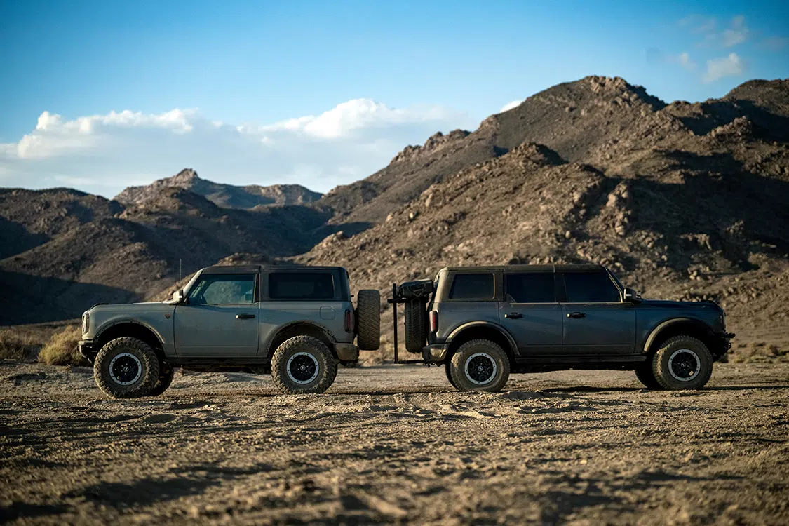 To test out the shocks, the Shock Surplus team hit the California desert and put two Broncos to their paces. A 4-door Bronco had King Shocks installed while a 2-door Bronco sported a set of the Fox Performance Elite. After a couple days of pushing the two Broncos out in the wild, they came away with some solid insight. We caught up with them after the trip to learn their discoveries.