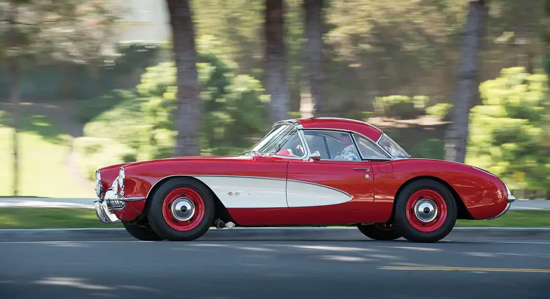 Small A/C vents are evident in the dashboard, plumbed to a modern system under the hood. For those who do not know or remember, air-conditioning was not an available Corvette option in 1957. There is a custom tonneau cover that can be snapped over the passenger side to provide a classic sports car look when out for a solo drive. Nielsen’s Corvette is equipped with the soft convertible top, hidden by the hinged cover that flows into a waterfall effect between the seats, and the car has a removable hardtop as well. Driven as an ‘open car,’ or with the soft top up or hard top installed, the classic lines of a 1957 Corvette are appreciated everywhere.
