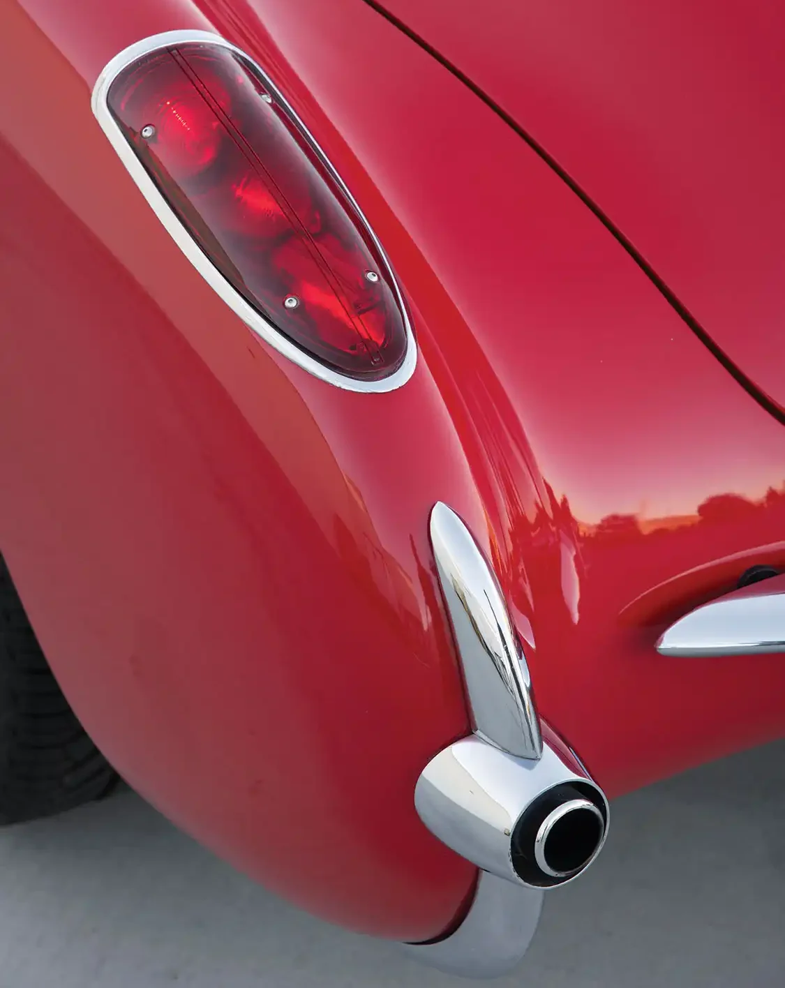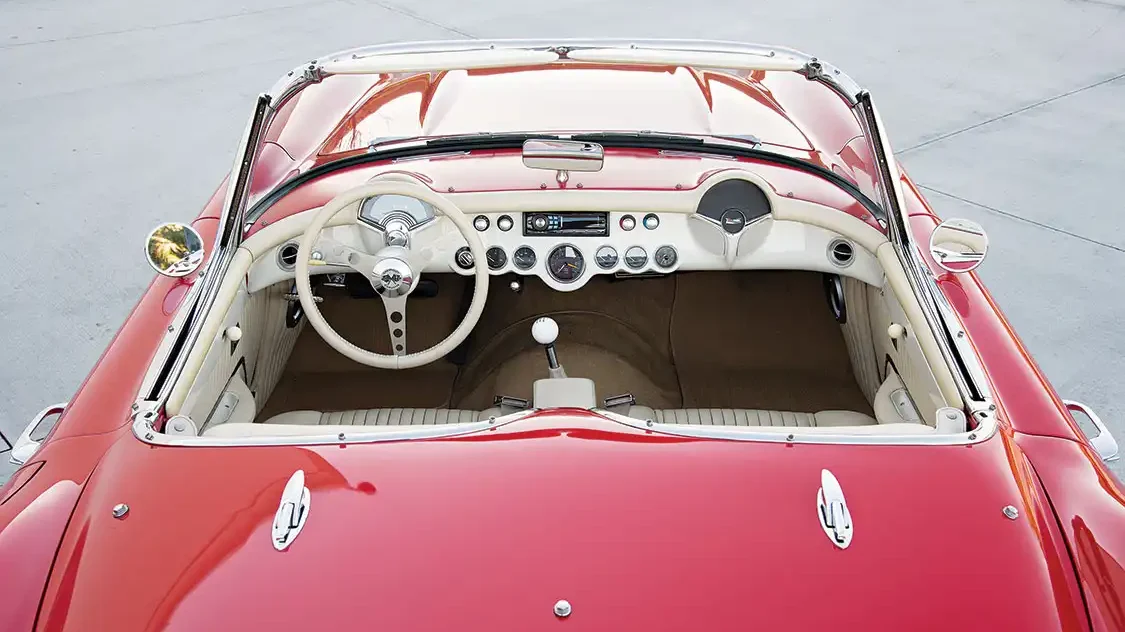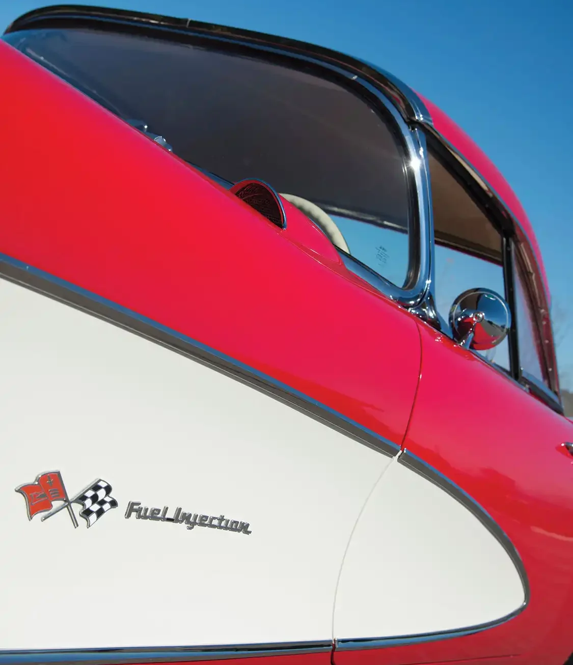 Body work was an entire reboot. The previously applied gel coat had to be removed by grinding, a messy job. The body was completely re-skinned. “The air scoops on the top of the front fenders had to be painstakingly added again, as they were deleted by a previous owner during the drag racing era, explains Nielsen. “All gaps for the doors, hood, and trunk were fitted-in at 1/8th inch.” It is without exaggeration that we recognize that no Corvette of that era ever rolled off the assembly line with tolerances that tight. It was necessary for Jim to construct all-new wheel wells, since the now fully independent suspension changed the amount of wheel travel. Close inspection at the rear of the Corvette will reveal that the taillight lenses are sourced from a 1958 Corvette, as these longer, full length lenses follow the graceful contour of the rear fenders without visual interruption. The small center strip of stainless trim has been removed so not to distract the eye. The exterior paint is Rossa Corsa, a gorgeous 2008 Ferrari red hue. The side coves are painted in Shoreline Beige, just as they could be specified in the very same color in 1957. The cost for the two-tone option that year was $19.40.