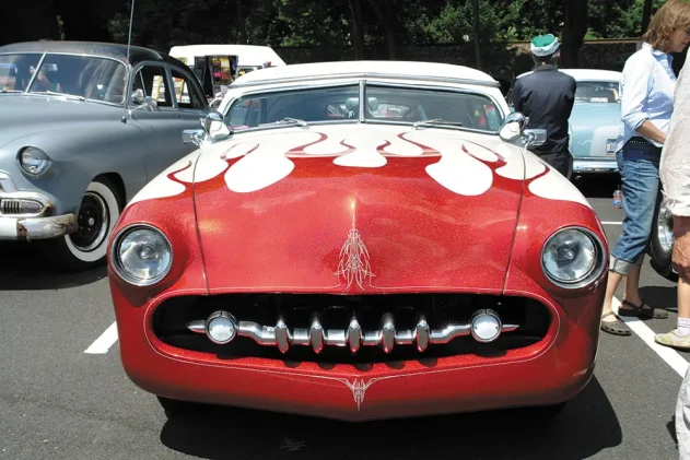 The vendors offered an amazing array of Kustom Kulture artifacts from magazines to short-brimmed hats, tiki heads, and posters. The girls, all of whom looked as stunning as bowling-calendar pinups in spiked heels and tattoos were selling hand-made kitch and jewelry. Hot dogs and Cokes are the cuisine of choice but if you play your cards right you might be able to get a “PBR” (Pabst Blue Ribbon), this show’s unofficial sponsor. I do believe I purchased the ultimate in Kustom Kulture kitch: A red metalflake-painted toilet seat cover with a ’40s pin-up girl provocatively posed in the center. (Don’t worry the pinup is old, but the seat is new) Upon seeing this work of art, there’s only one thing to say: “cool ”.
