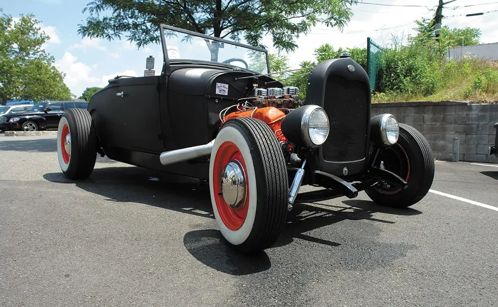 On Saturday, I got my ’62 T-Bird ready for the Road Devils 4th Annual Peel Out, held in a parking lot in South Orange, New Jersey. This is a hot rod show, more accurately, rat rod show. There are no trailer queens here, just the backyard-welded, handmade, knuckle-busted, blood and guts hot rods and customs whose only set of rules is to keep it real. These rods are raw, loud, beasts with imagination, humor and the ingenuity to make a vehicle out of junked parts. They don’t take themselves too seriously, with flat rattle-can black or rust being the finish of choice, and skulls, pin-up girls and spiderwebs the standard motif. I donned the appropriate apparel: black muscle-tee, jeans, and black shoes and drove up in my black car with left arm hanging out the door to show off my newly-minted pin-up tattoo, and my entry was assured. I handed the guy at the gate $10 and he looked over the Bird, nodded and said: “Cool”. My car was one of three cars at this show that actually had shiny paint (but it was accepted anyway).