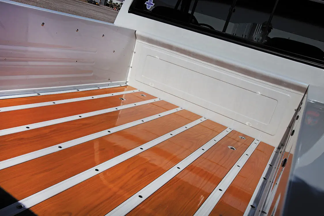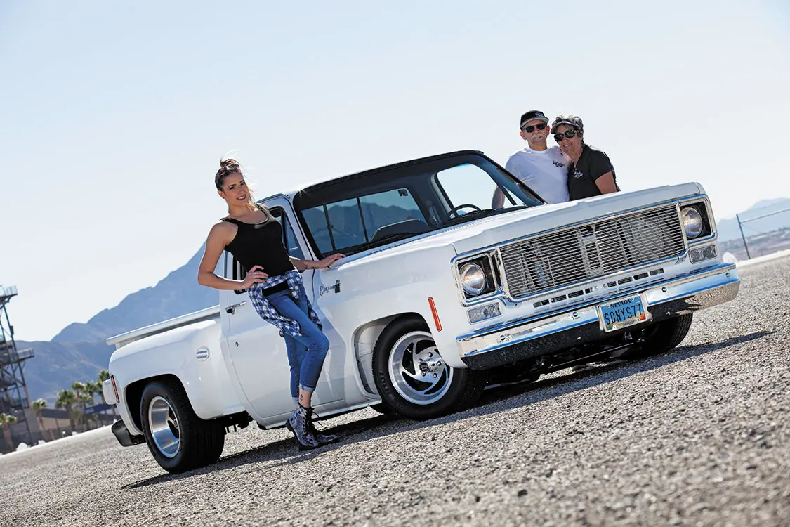 But what truly sets this C10 apart is the exterior, transformed by the skilled hands of Cheyenne Ruether. Known for her appearances on “Vegas Rat Rods” and her co-hosting duties on “Backyard Ballistics,” Cheyenne is a painter and fabricator of extraordinary talent. At Nefarious Kustoms, she rendered Sonny’s vision in paint and metal. The Matrix Ice Pearl over Toyota Super White basecoat is a work of art in itself, but Cheyenne didn’t stop there. Her signature is airbrushed on the tailgate, a personal touch that marks her involvement in this build. The standard Chevy Cheyenne emblems were replaced with custom pieces derived from her own signature, adding an exclusive finish to the truck’s identity.