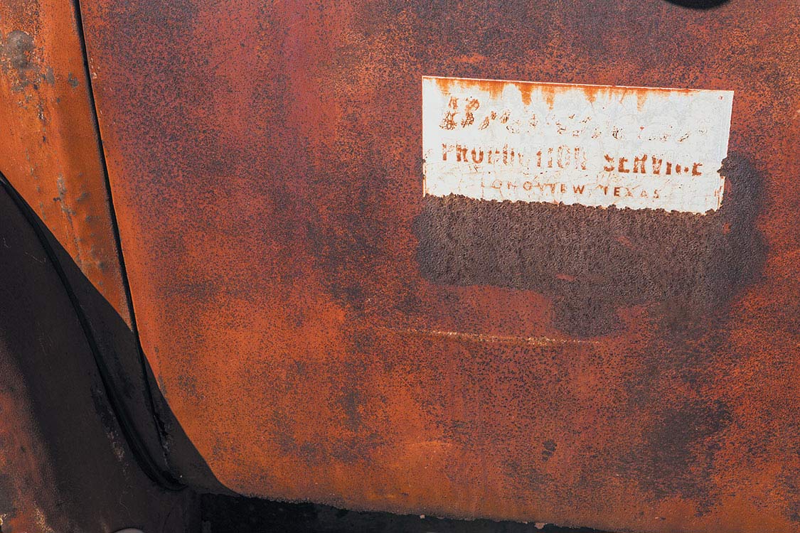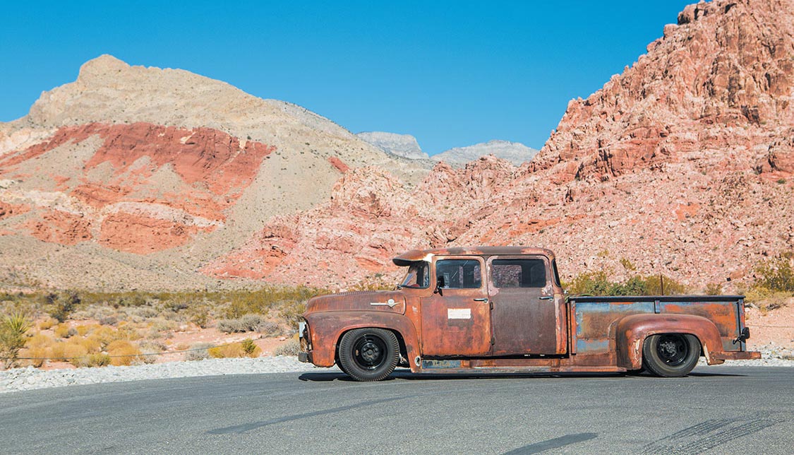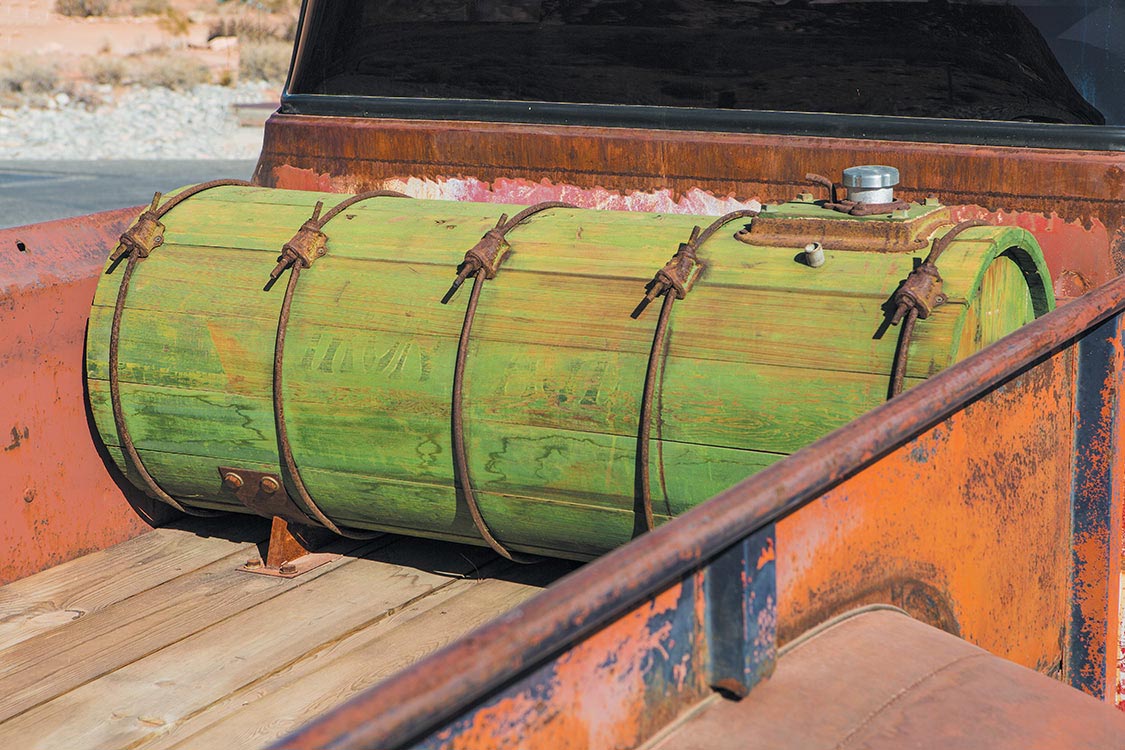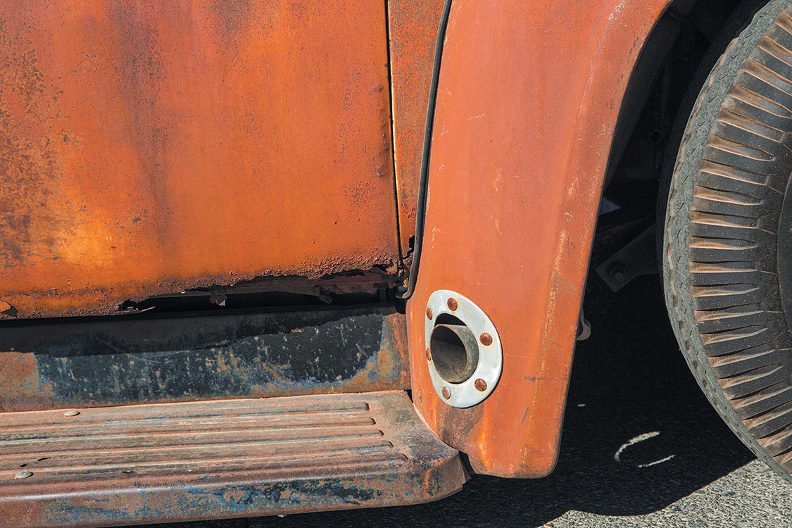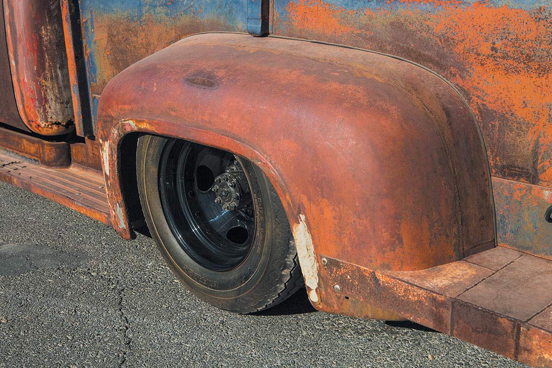 For this crew cab’s exterior, it’s a combination of good ol’ fashioned rust and some trick bodywork. The massive stock front fenders of the F-600 remain in place. Together with the cab visor, they make for a heavy presence. The rear fenders were widened by 3 inches each. The wider rear stance keeps the slammed body lines looking parallel. The rear of the cab boasts some serious custom work. George Barris adapted the big rear window. He also fabricated the custom hood louvers. Surface rust covers just about every inch of the F-600, and in some places like the lower door sections, there is real rust. The proportions of the crew cab and stepside sit beautifully on the RV chassis. The preservation of factory features, along with the custom cuts, works perfectly together.