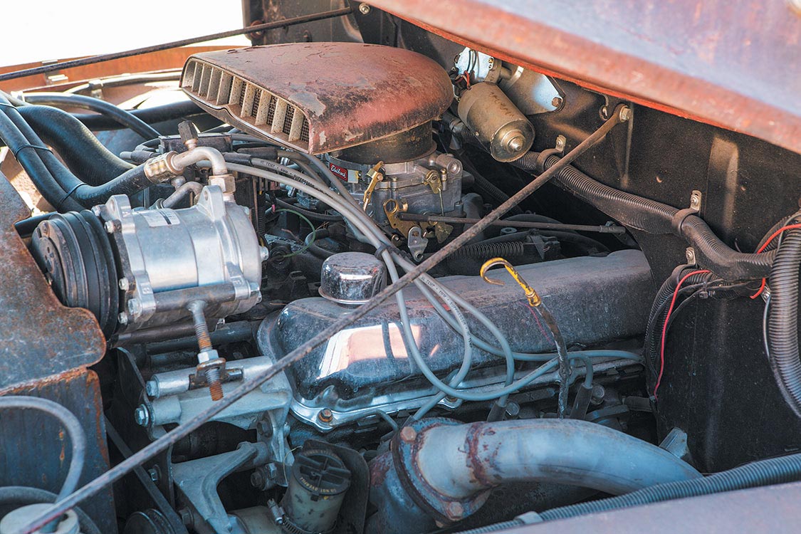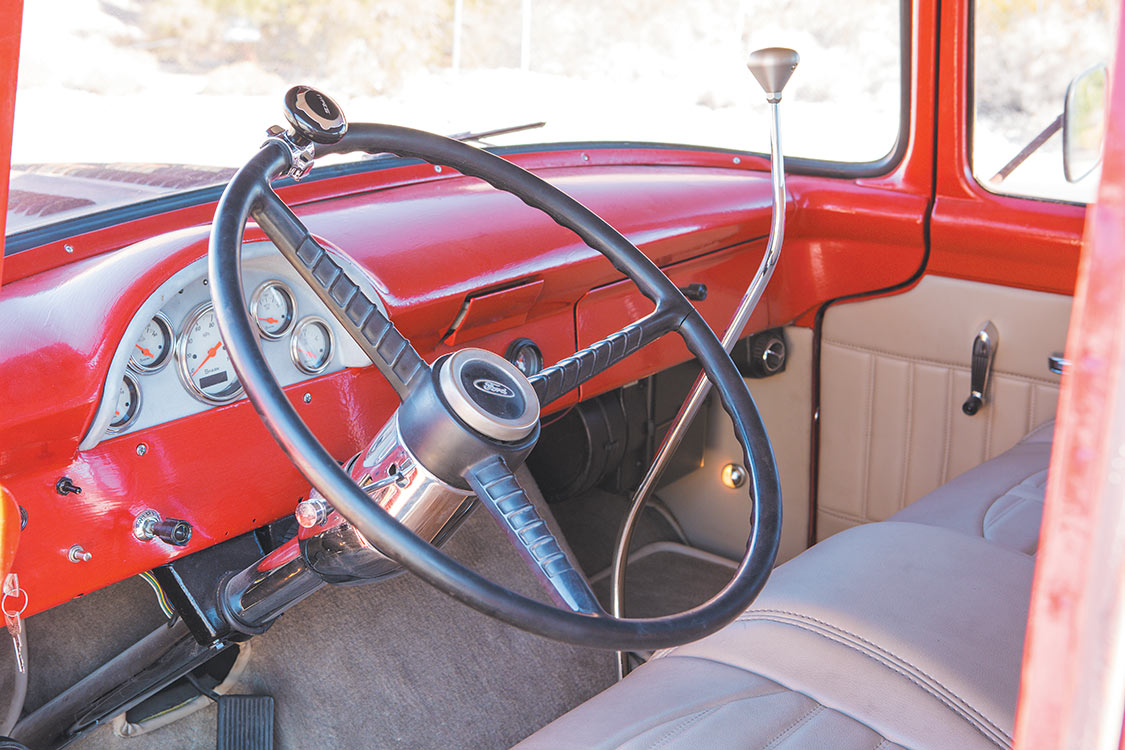 Now for going-power, Derrick and Riley kept in the Ford family. Mounted on the motorhome chassis is a Ford 460 big-block V-8. The 1983 unit was built in the heyday of its popularity. The 7.5-liter V-8 was widely applied to Ford’s consumer line of cars and trucks, commercial vehicles, boats and motorhomes. The 460 and 429 make up the Ford “385” series, named for the 3.85-inch crankshaft stroke. This particular 460 was rebuilt to factory spec and topped with an Edelbrock four-barrel carb. Myron Tolf in Aurora, Colorado, carried out the engine build. The 7.5L breathes through a custom 3-inch exhaust that dumps through the front fenders. It’s hooked to a Ford E4OD transmission from 1994. Trans Plus II in Las Vegas outfitted the unit with a Bauman electronic controller and Lokar shifter. The rear-end uses a 4.10 gear ratio.