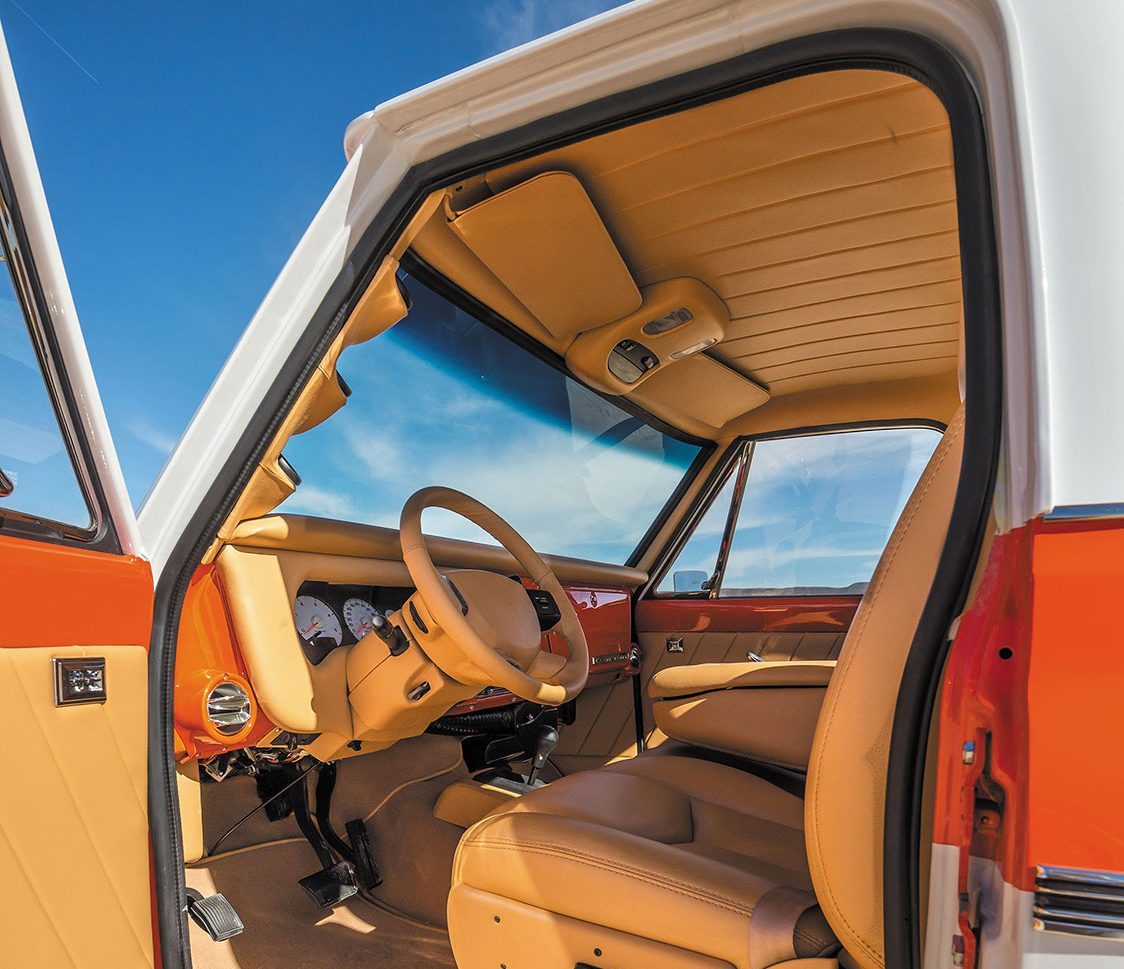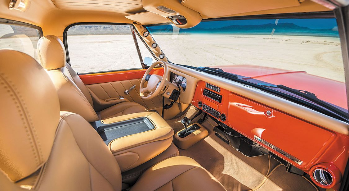 A full custom interior is both modern and classic at the same time. It features seats out of a 2005 Chevy truck, OEM Dodge gauges and a full custom tan leather interior by Pacos Upholstery.