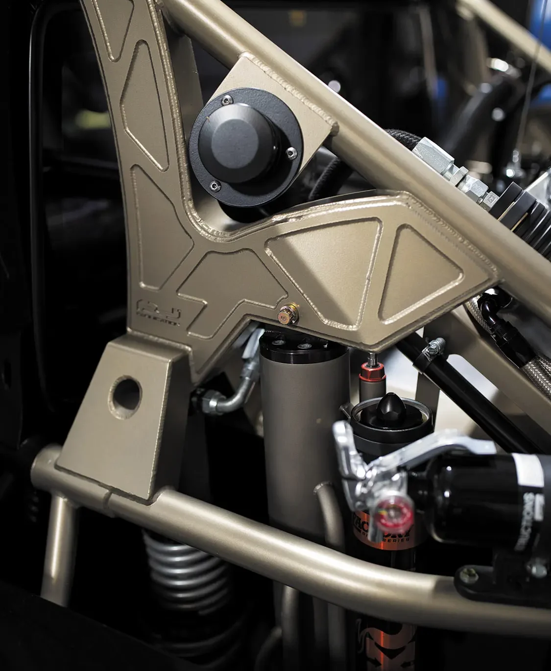 Interior & Stereo: PRP Podium seats covered in beige marine-grade vinyl by Rudy’s Custom Upholstery; Crow Safety Gear harnesses; Custom aluminum dash, center console and panels built by RJ Fabrication and covered by Rudy’s Custom Upholstery; Custom RJ Fabrication 2-inch chromoly rollcage; Speedhut and Fuel Air Spark Technology gauges; MOMO steering wheel; Rugged Radios push-button communication system with AlphaBass headsets