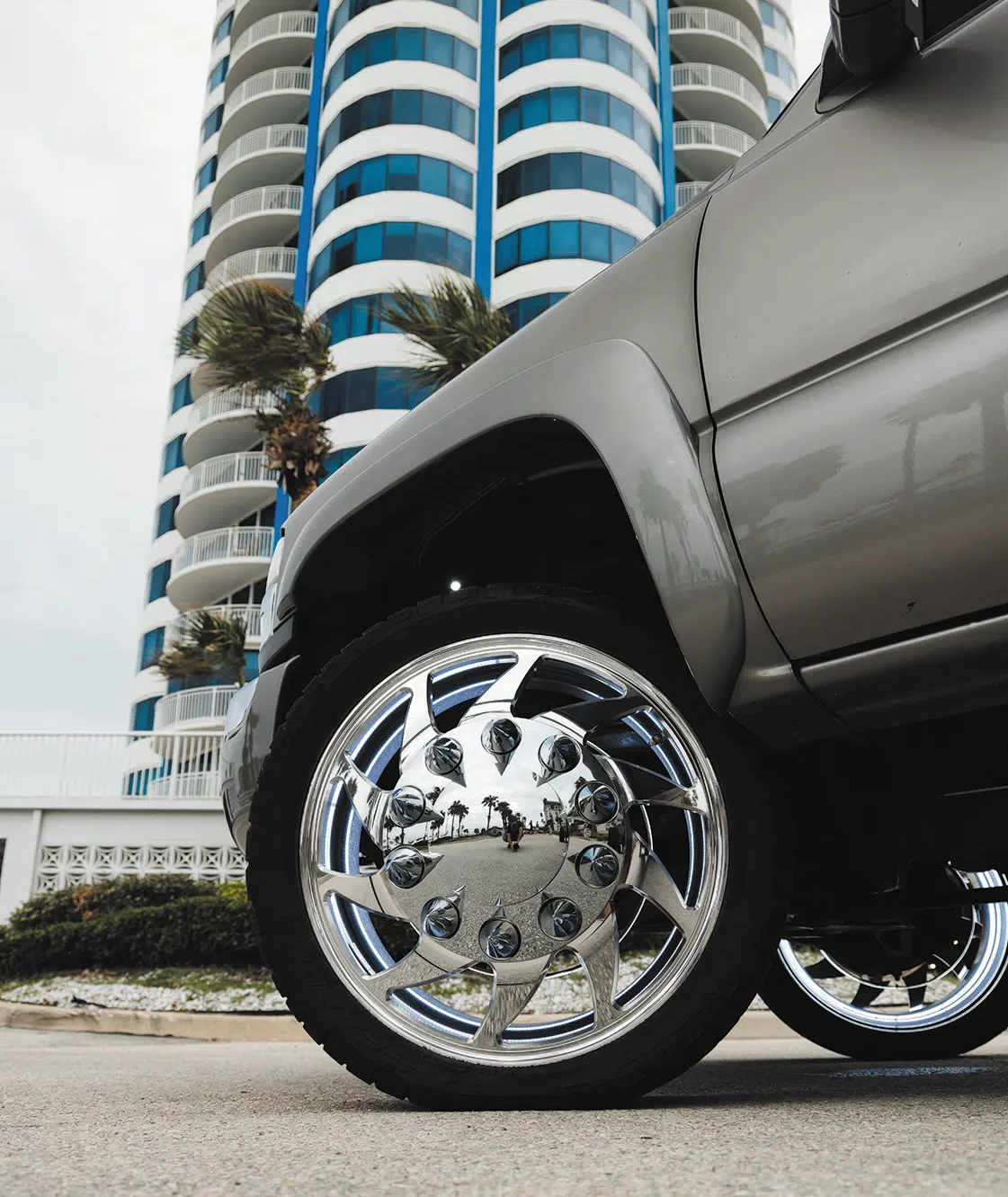 As a custom truck nut, though, Dan also had to make some changes to make the truck his own and add to the GMC’s legacy. The most dramatic of those changes was the set of custom-cut 24-inch wheels, which started out as standard Alcoa semi wheels before Wheels-A-Million got down with the CNC machine and custom-cut a design that Dan helped create. A 4-pack of 305/35R24 Nitto Terra Grappler G2 tires provide plenty of meat, which get extra traction with the help of the Wehrli Custom Fab traction bars mounted between the rear axle and frame. Wehrli also gets the credit for the skid plates, while a combination of Recon, Twisted Pro, and North Georgia Lighting LEDs add plenty of illumination both above, around, and below the cab and bed.
