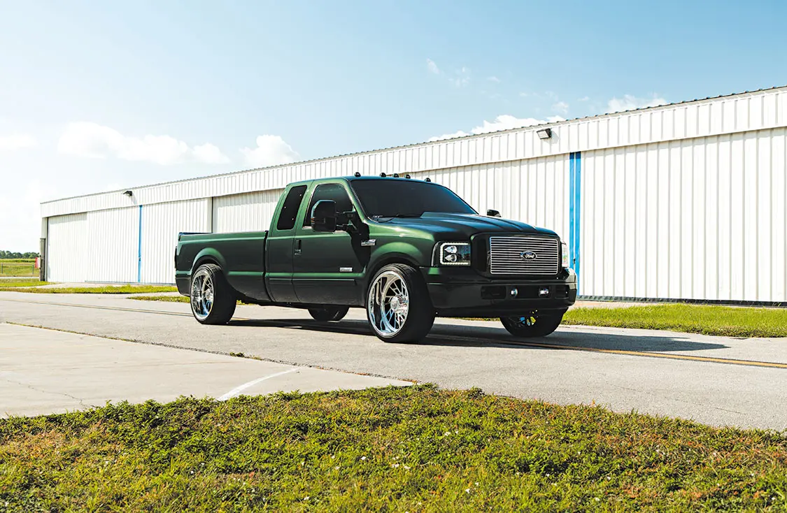 Once the Ford was mechanically sound, David could then start on the cosmetic issues. The first modification was lowering the front end down 4 inches and 1.5 inches at the rear. Next, a set of 24×12 Specialty Forged wheels, a 2005 front end, and color-matched exterior trim were applied, and the entire truck was resprayed with factory Highland Green Metallic paint for good measure. The interior space was then upgraded with a brand-new set King Ranch seats from Richmond Upholstery, an F-650 lower dash panel capable of running auxiliary gauges, a US Speedo stainless cluster and various billet pieces, along with a painted dash and trim pieces for a cohesive overhaul throughout the cab.