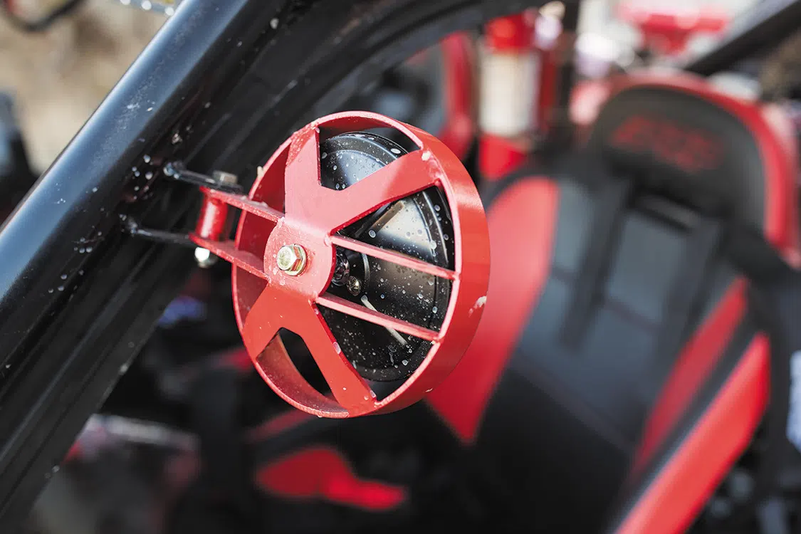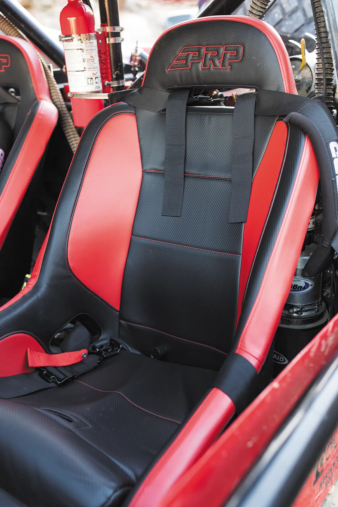 In addition to the Toyota cab, Patrick outfitted the race car with Xprite USA pod headlights, as well as Project X Offroad secondary lights. The car also features TMR Customs brackets and fire extinguisher mounts, as well as two Superwinch winches—one in the front and one in the rear with additional Gy6 Offroad recovery gear in tow. The black and red color scheme on the car is a vinyl wrap with custom graphics done by both Patrick and his friend Nate, co-producer of Dirt Road Journey off-road videos.