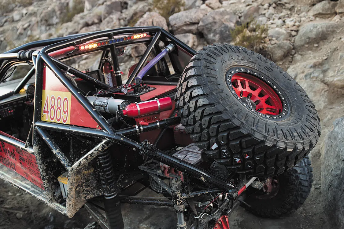 Sticking with race-ready toughness, Patrick outfitted his rig with 17-inch Dirty Life Canyon Race beadlock wheels wrapped in 37/13.5R17 Maxxis Razr AT tires with 3.5-inch backspacing both front and rear. Braking power for the rig is provided by disc brakes on all four corners, fed by a GM master cylinder and Toyota brake booster.