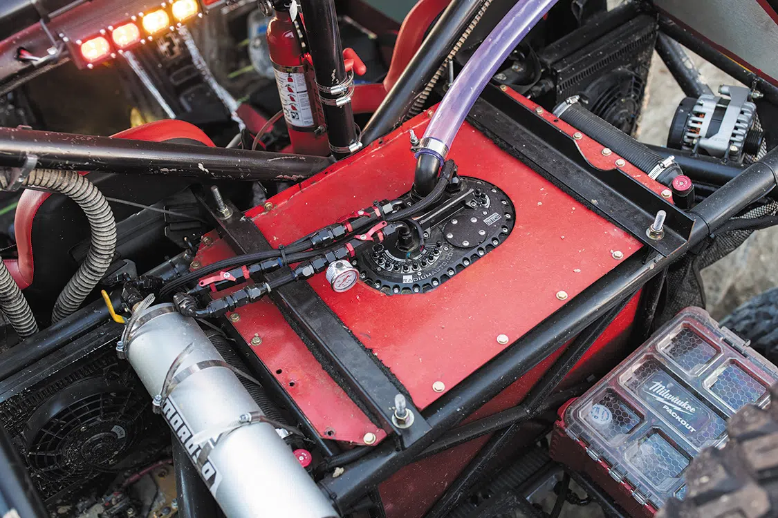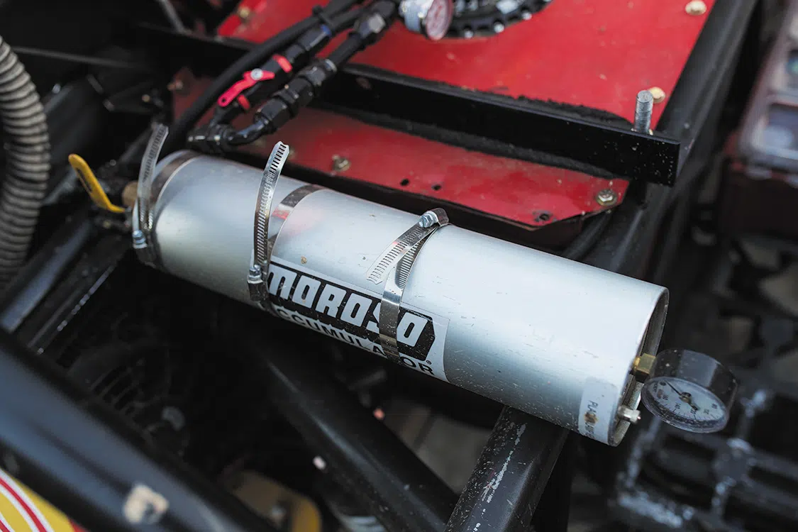 WWith the chassis fully fortified, the engine and drivetrain for the car also had to be of utmost strength. Of course, there was also power output to be considered, so Patrick opted to equip his rig with a 2004 5.3L LM7 V-8 built out with a Brian Tooley Racing Stage 2 V2 truck camshaft, upgraded valve springs, and a high volume oil pump backed by a Moroso accumulator. Fuel for the engine is fed from a 32-gallon Fuel Safe fuel cell with a Radium Engineering universal fuel surge tank, while exhaust is expelled via modified headers and a custom 2 ½-inch exhaust system.