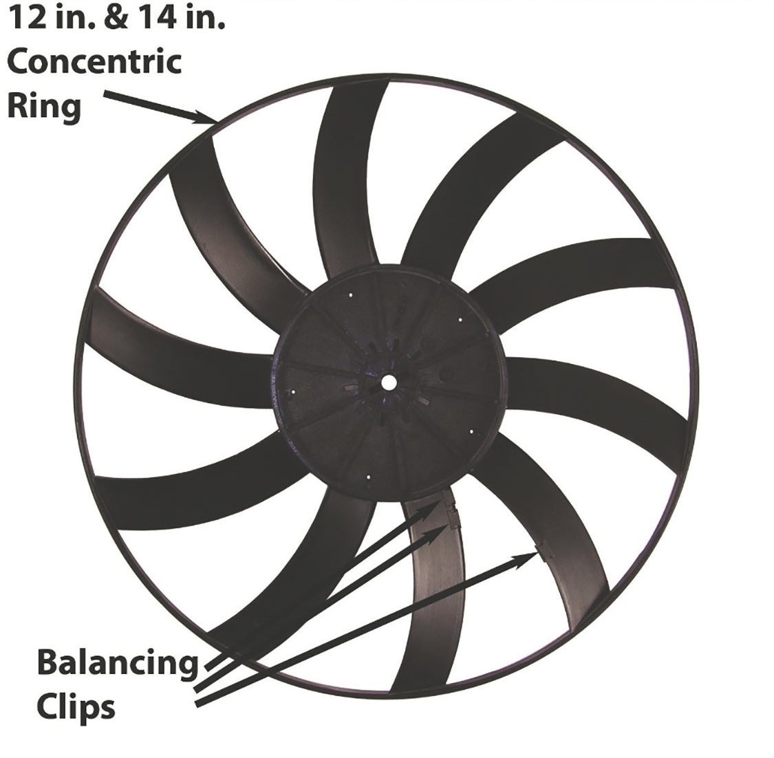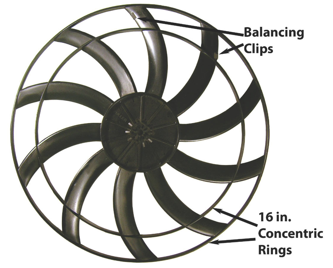 Concentric Rings – To create a stable surrounding for the blades of larger fans (16-inch diameter), durable glass-filled nylon concentric rings are used to tie fan blade tips together. Two rings, one outer and one inner, are used on 16-inch fans to add stiffness to the blade and prevent it from flexing rearward (into the shroud) at high RPM. Smaller fans (14- to 12-inch fans) have one outer ring preventing blade flex and distortion. The rings also reduce noise by preventing harmonic vibrations that can occur when individual blades rotate at high speeds.