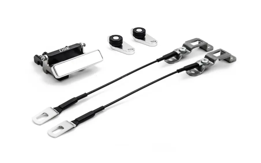 The package includes a billet tailgate handle, Delrin trunnions, and rubber‑coated support cables, all engineered to reduce wear, eliminate rattles, and deliver smooth, controlled tailgate movement. Adjustable mounting points allow builders to dial in proper alignment for a clean, consistent closure.