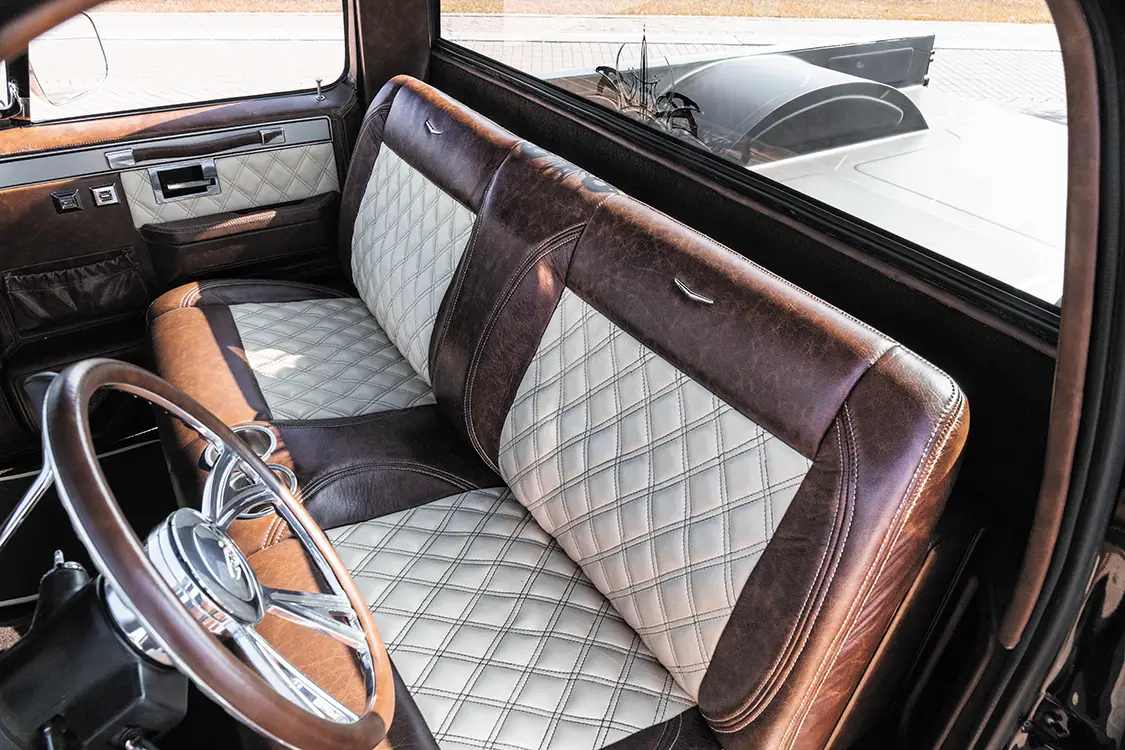 Feliciano and Dora didn’t stop at just performance and stance; they went all in on the interior, too. Thing 2 features a full custom wrap in real cowhide leather, while Thing 1 keeps it closer to OEM, also dressed in fresh cowhide for that classic-meets-custom look. Credit goes to Eleazar Guajardo at Bruno’s Upholstery for bringing the cabin game up to par, while Efrain Garcia at House of Sound handled the sound and interior tech across both builds.