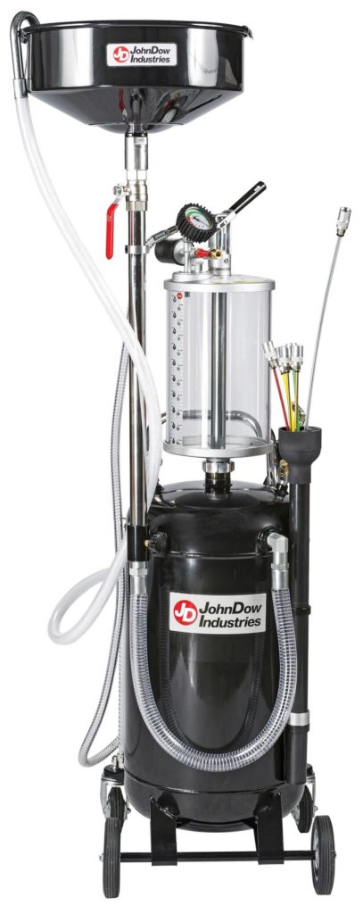 JohnDow Fluid Evacuator and Oil Drain Combos remove used oil and other non-flammable fluids from any vehicle when conventional draining methods are not practical. It uses a combination compressed air/venturi vacuum system to remove fluids through special probes and adapters connected to the suction hose. This makes the drain combos perfect for European and other vehicles not equipped with drain plugs and for easily correcting overfills. And when the tank’s full and needs to be emptied, it can be done quickly and mess-free using the included evacuation hose. Other features include: