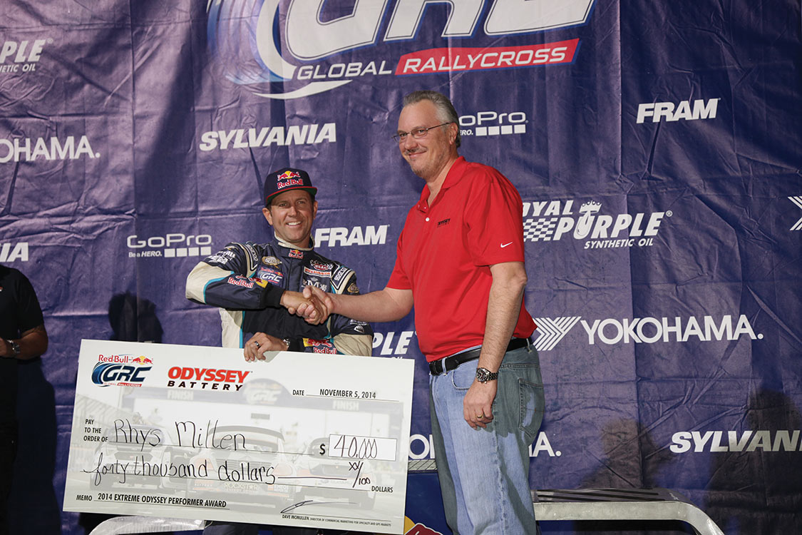 Odyssey battery by EnerSys, an official battery of Red Bull Global Rallycross (Red Bull GRC), presented Red Bull GRC driver Rhys Millen with a bonus check in the amount of $40,000 as part of the Extreme Odyssey Performer contingency award program.