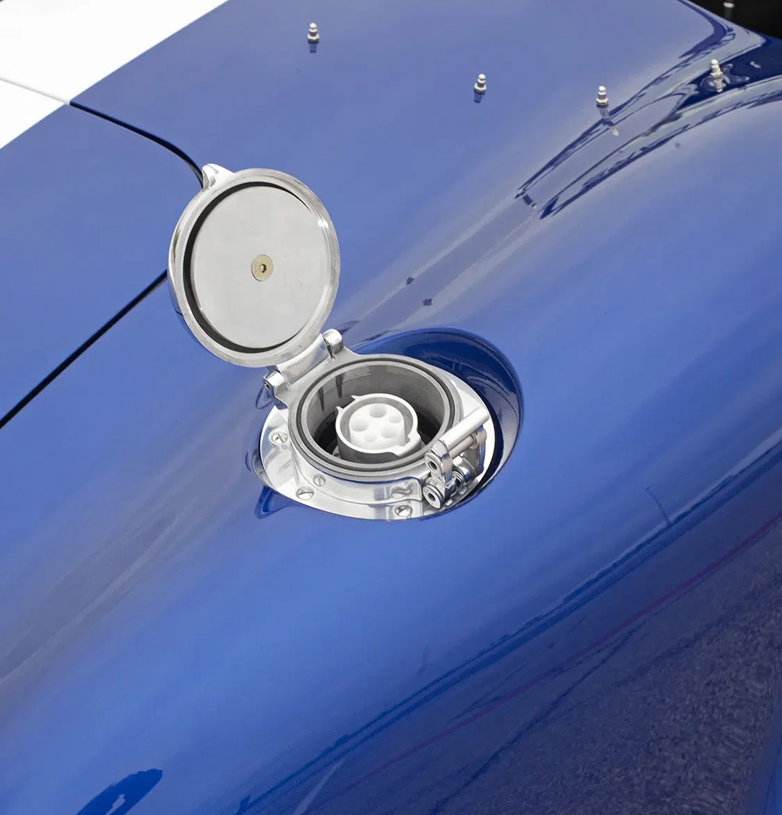 The E-Cobra begins its journey as a brand-new, licensed Shelby Cobra chassis from Superformance; the team at E-Muscle Cars skillfully transforms these timeless machines into electric dynamos. The traditional gas engine and transmission make way for a Tesla Performance large drive unit, delivering over 466kW/625hp and boasting a max voltage of 427 volts—a witty homage to the iconic 427 cubic-inch engines. This electrified Cobra not only maintains the legacy of its ancestor with a blistering 0-60 mph time of approximately 2.5 seconds but also sets new benchmarks in performance. This formidable power source, coupled with a Quaife Automatic Torque Biasing limited slip differential and controlled by an AEM VCU200 motor control unit, ensures that the E-Cobra delivers an exhilarating driving experience, honoring the spirit of the original.