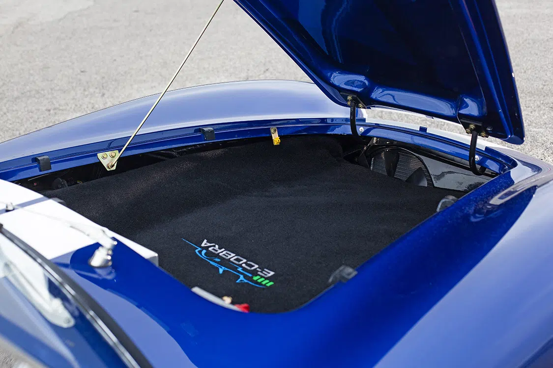Beyond its breath-taking performance, the E-Cobra surprises with a practical front trunk, providing storage space despite its extensive battery packs. The vehicle’s robust steel frame is expertly modified to house the electric drivetrain.