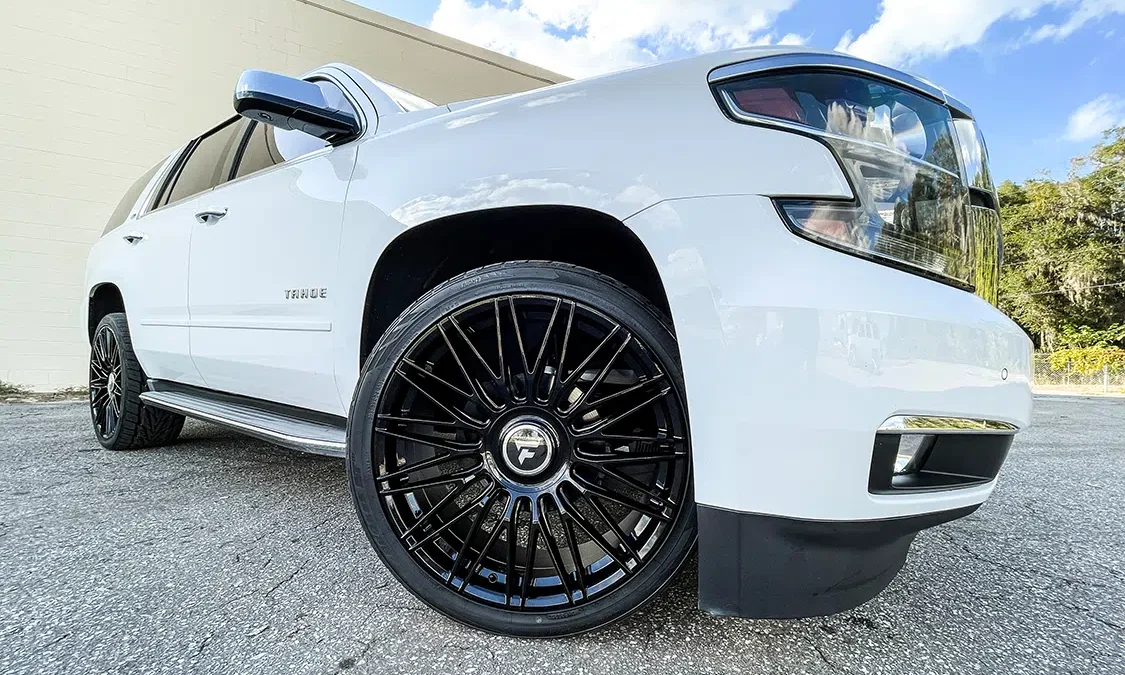 01. We’re talking about the basics of upgrading our 2015 Chevy Tahoe with a new set of aftermarket wheels and tires.02. When considering aftermarket wheels for a daily-driven family vehicle, preserving the original wheel/tire dimensions is paramount.03. To ensure compatibility, we employed the tire size calculator from Motortopia.com. This powerful tool facilitated matching the new 24-inch wheel-and-tire combo to the factory-installed 22-inch setup.3(a)04. Our choice, the Large Diameter SUV Mesh Wheel 369 from Fittipaldi Wheels, blends A356 aluminum alloy and T6 heat treatment for exceptional strength while exuding captivating style.05. For tires, we chose the Toyo Proxes STIII tires, size 285/35-24. Toyo’s promise is both performance and style, which will be ideal for our daily driven Tahoe’s upgrade.06. With the current wheel-and-tire combo picked and ordered, we headed over to Exclusive Offsets for the mounting and balancing process. Be sure to pick a reputable facility to ensure your wheels and tires are properly mated. You will regret it if they do not balance them correctly or if they scratch you brand new wheels.07. While the mounting and balance process is being handled, we will use a breaker bar to crack the lug nuts loose before jacking up the truck. We do not recommend making your impact gun do all the work here.08. Now that the lug nuts are loosened, we can slide the jack under the frame rail and support it with a jack stand. We only need to do one wheel at a time.09. Now we can use the impact gun to fully remove the lug nuts and pull of the original wheel.10. Before diving into the installation process, it’s vital to inspect the vehicle thoroughly. We recommend checking the original brake pads to ensure they’re in optimal condition for the upgrade. Safety is paramount, and maintaining brake health is non-negotiable, especially with larger wheels.11. When installing the new wheels, proper lug nut selection and tightening are crucial as well. These Fittipaldi wheels will require a set of new acorn-style lug nuts, as the factory ones are incompatible.12. Many of today’s off-the-shelf aftermarket wheels are dual-drilled to fit multiple different lug patterns. These Fittipaldi wheels are no different. They are drilled for both Chevy and Ford 6-lug patterns, so don’t panic if the first one doesn’t fit. Turn the wheel and try the other pattern, which will inevitably work.13. Do not use the impact to start threading on the new lug nuts! Always start them by hand. This will guarantee that the threads are not stripped, which will ruin the studs.14. With all 6-lug nuts started by hand, you can now use the impact gun to fully tighten them. The proper way to bolt the lug nuts on is in a star pattern, not a around in a circle.15. With the lug nuts tight and the center cap installed, we lowered the truck to the ground and removed the jack. This is when you should feel all around the tire and inside the wheelwell to be certain there is no rubbing or touching anywhere.16. With the front wheel complete and clear of any suspension pieces, you can see how the overall size is spot on with the original. Now we can move to the rear.17. Nothing is different with the rear. Remove the original, check the brakes, and install the new wheels using the same process.18. These new Fittipaldi wheels look amazing, and the floating center caps are super cool looking when cruising. Now we have an amazing custom daily-driven SUV that looks different from all the others on the road.18(a)