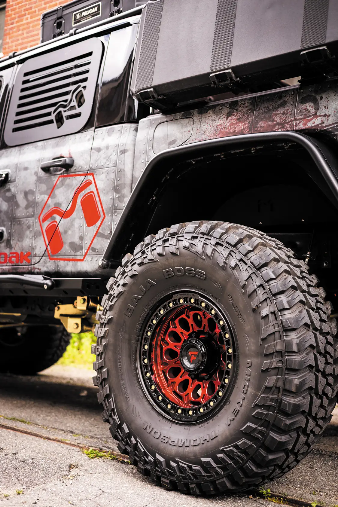 Now let’s talk flex! When it comes to Jeeps, Metalcloak is the name you want to have on your rig, and this machine is fully equipped underneath with a Metalcloak 4.5 long arm and 4-link combo with all-new Metalcloak Black Series shocks to give it that smooth ride and off-road ability when getting flexy in the rocks. Keeping this rig steering in the right direction, Ryan is sporting the Metalcloak 1-ton steering tie rod and drag link setup, as well as an Apex booster to the OEM steering box to effortlessly move the 40-inch Mickey Thompson tires around. Baja Boss tires are no joke and are a true work of art when it comes to grip both on and off the pavement. The wheels of choice are 17×9 Fittipaldi Off Road FB153s to give the Jeep the appearance that all off-roaders are looking for!