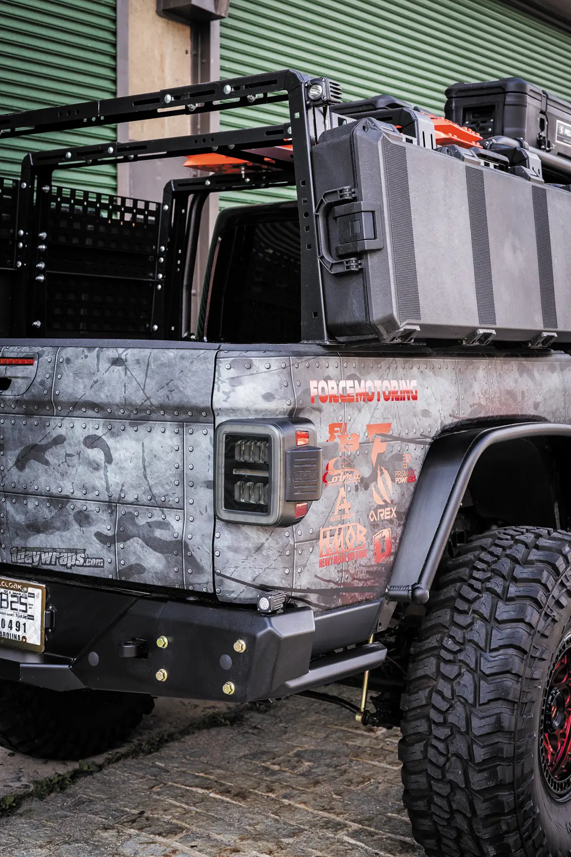 Working along the exterior, we have a set of Metalcloak aluminum overland fenders paired with Metalcloak aluminum inner fenders. A bright and very noticeable feature about this rig is its network of lights! This Jeep is kitted out with 10 Rigid Industries pods that have been strategically positioned on top of the roof rack and on the pillars and bumpers too for onlookers to find and bask in their glory! Other features of note are the ARS Over Cab rack system with catwalk and seal rack, Pelican vault cases on the rack sides, and a Warn Zeon XD 10-S winch. Another noteworthy addition is the creative and eye-catching wrap designed by 1 Day Wraps and installed by Evolution Designwerx.