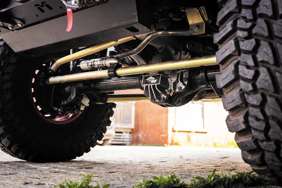 Attached to the Mopar monster is an OEM ZF 8HP95 transmission rocking the Jeep Rubicon NV241 with a 4:1 gear ratio, allowing it to possibly even walk faster than it moves. This is a key detail and tool to have when on the trails to allow for slow, methodical movements. Transferring power from the transfer case to those Dana Ultimate 60s, which are complete BEEF, is a set of Adams driveshafts, and inside those massive axles is a 4.88 gear ratio both front and rear paired with Eaton E-Lockers. With all of that comes a lot of weight, and with weight you have to be able to stop all that movement. With this build, Ryan chose to go with Dana 1-ton Ram brakes at each corner with an OEM master cylinder with a booster to help that extra pressure.