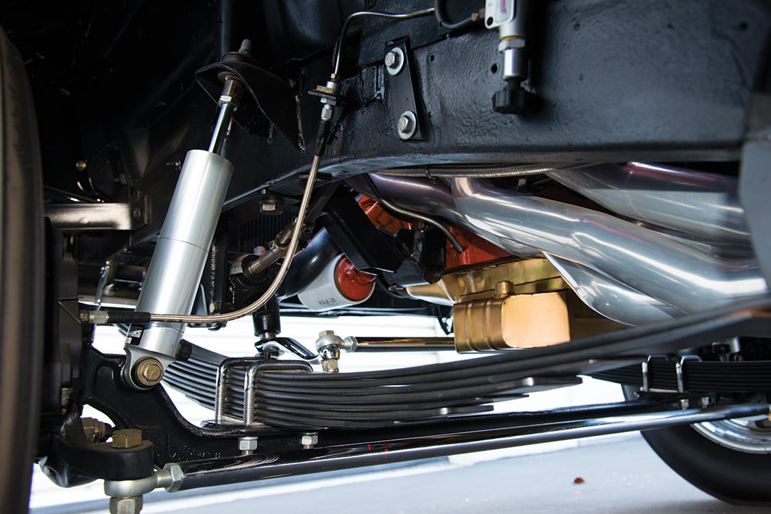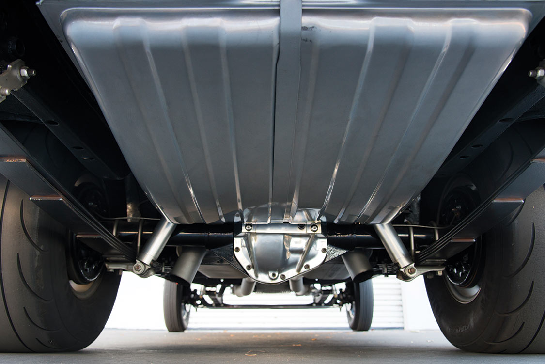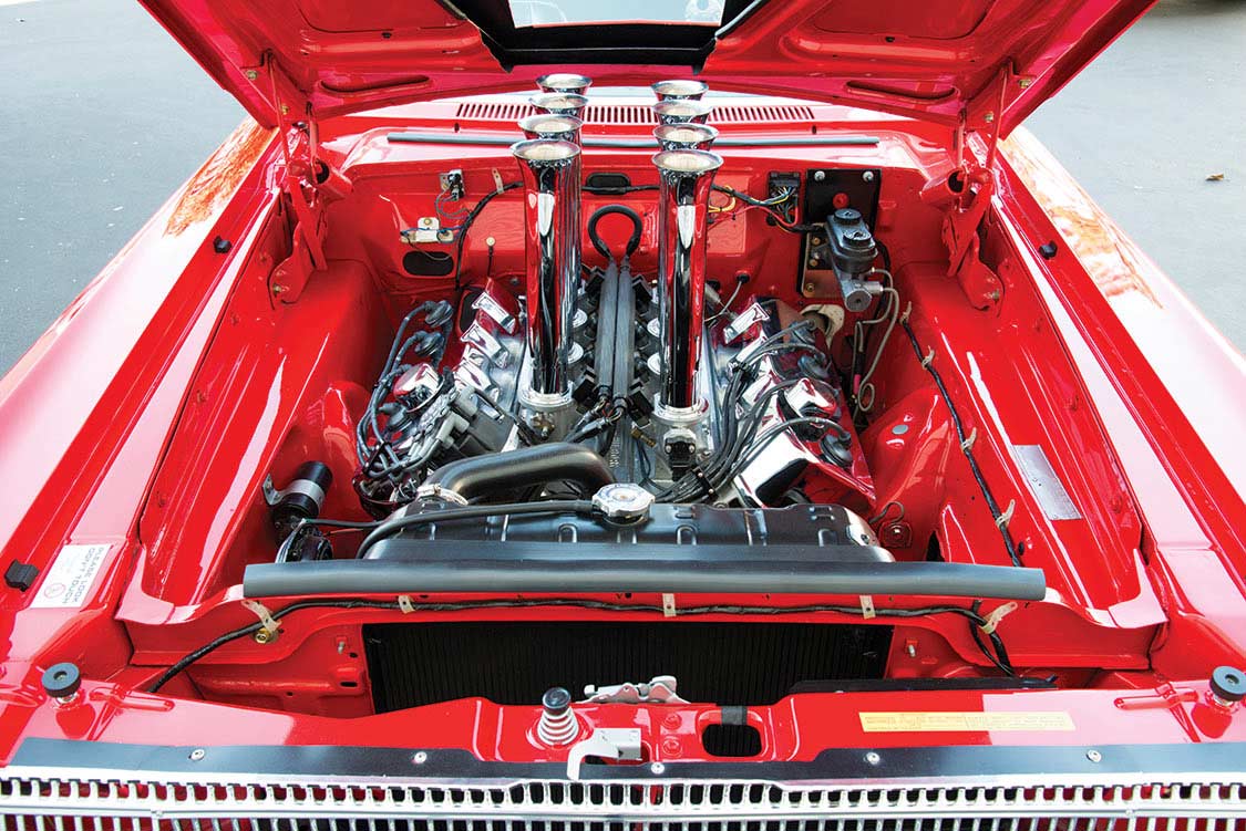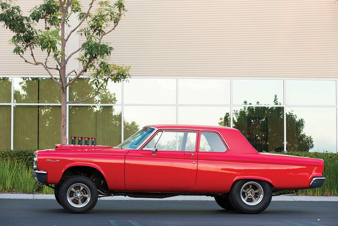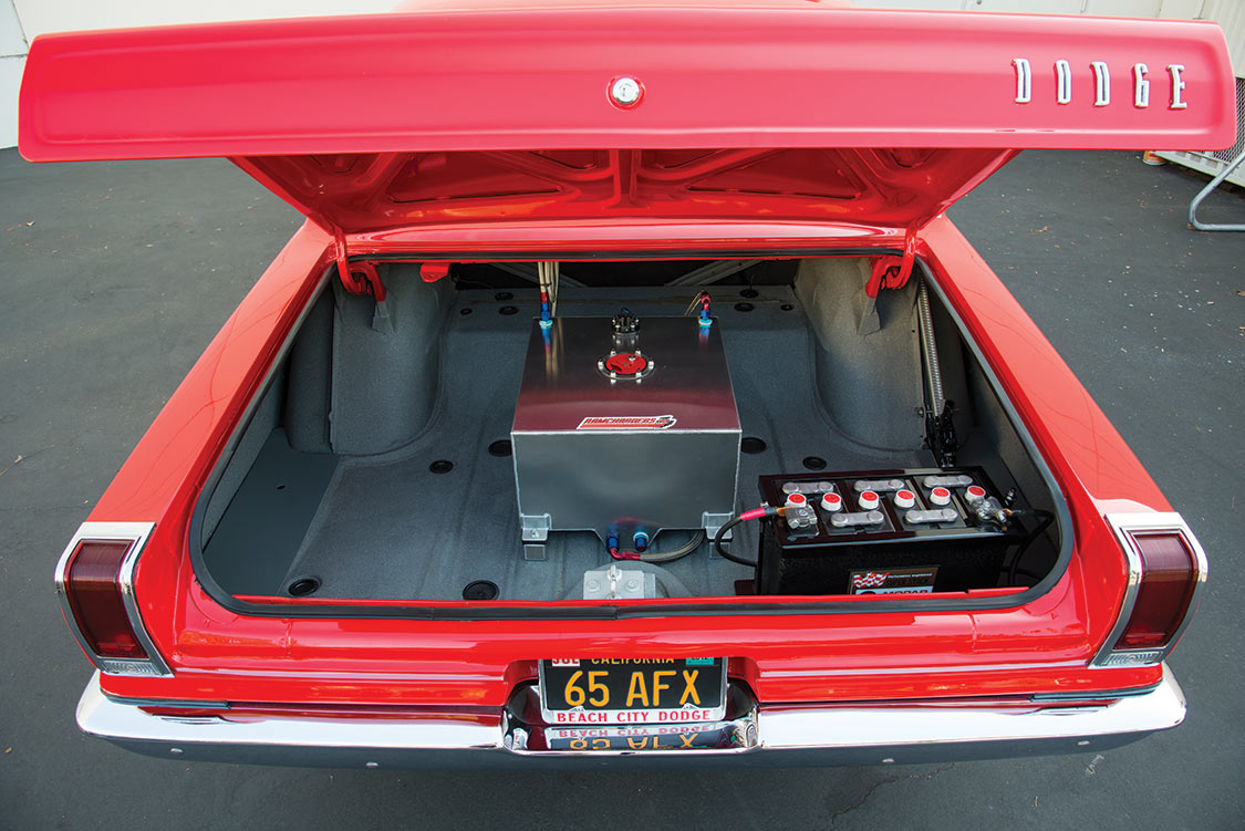 The most dramatic change was to the front suspension. All of the stock components were removed and replaced with a dropped front axle from a Dodge A100 van, just as had been done in 1965. Jim credits Dale Snokes and his shop, The Metal Shed of Pomona, California, for the correct conversion. The rear was mini-tubbed. “Dale took one week,” Jim told us. The rest of the suspension, engineered for street use, is equipped with QA1 shocks with factory-style Super Stock leaf springs at the rear, along with a pinion snubber on the 3.54 with Sure Grip-equipped Dana 60 rear axle.