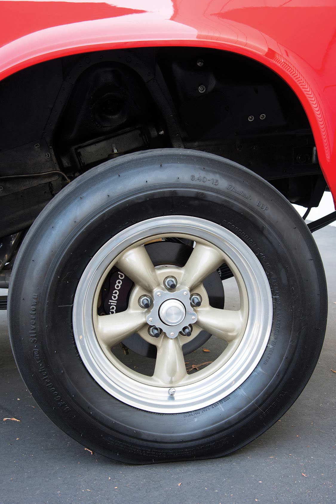 The Torch Red (a modern Corvette color) Dodge rolls on American Racing wheels: 10 inches wide on the rear, strapped with M/T Drag radials sized 315x50x15. Fronts are 4.5-inch widths, with era-correct BF Goodrich Silvertown tires in the proper 6.40×15 configuration.