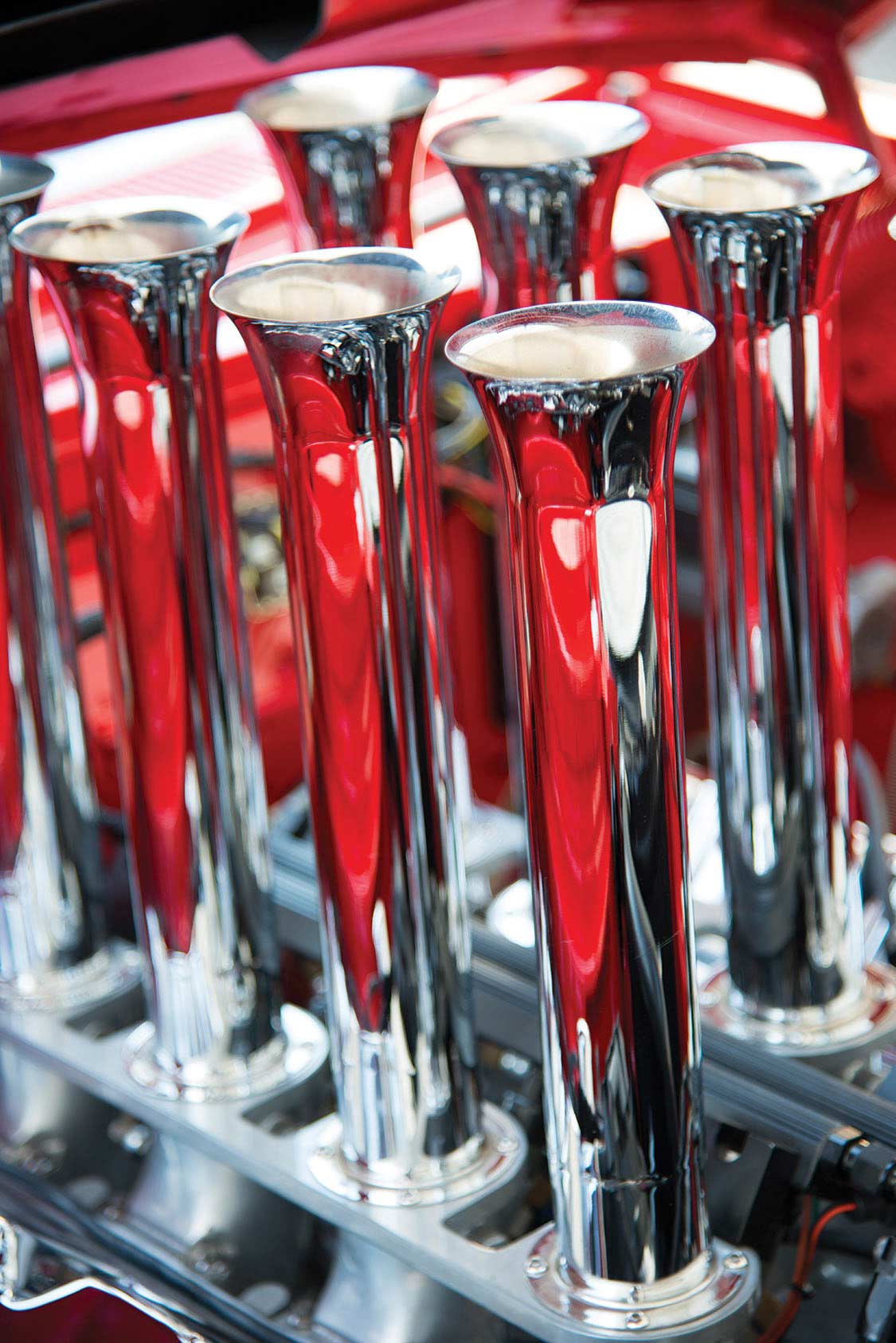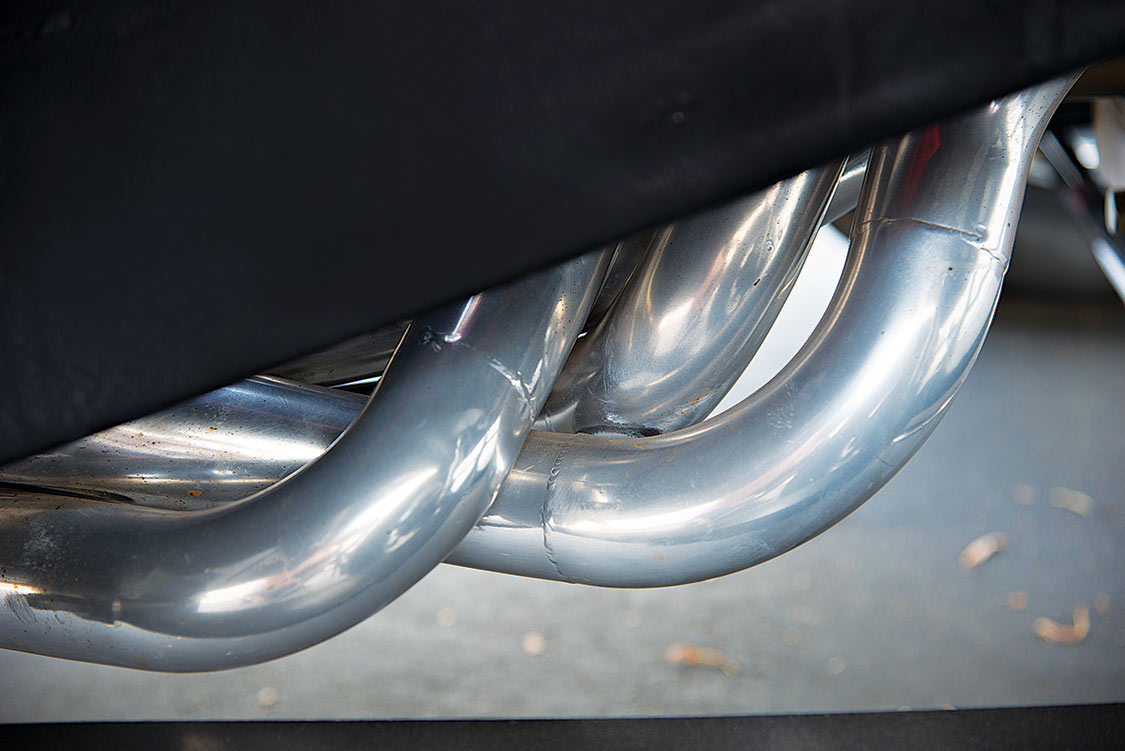 Within two months after purchase, Jim put the Hemi on a carb-free diet and installed a Hilborn fuel-injection system. “It’s an EFI system suitable for street use,” he says. “I wanted the 13-inch-tall stacks sticking out above the hood scoop that had been cut away, just like in ’65. The stacks were custom-built from aluminum tube stock supplied by Hilborn. I even made certain that it has the proper black stripes near the top. Those stripes back then were actually electrical tape, the look is also period-correct. As the factory teams were experimenting with tunable stacks of various lengths, they discovered that the longer/taller tubes offered more torque. The bells at the top of the stacks were affixed with the black tape.”