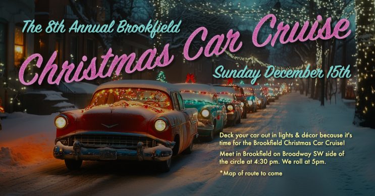 Hey Brookfield friends! Can you believe it? This is the 8th year of the Brookfield Christmas Car Cruise! It’s time to deck out your cars with lights, tinsel, and all the festive touches you can think of and join us for this joyous community event. Let’s light up the town together and spread some holiday cheer! Meet in Brookfield on Broadway SW side of circle at 4:30 pm. There’s a good stretch of angled parking in front of businesses that are mostly closed by then, so an easy place to start from. Plan to roll out at 5pm, we’ll tune our radios to the Holiday music station & cruise around town from there. This is a simple fun even open to anyone who is willing to get down with a bit of Holiday cheer, decorations and car shenanigans! The more the merrier!