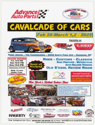 Advance Auto Parts Cavalcade of Cars 2025 Event Center, The Fairgrounds 5820 South Park Ave, Hamburg NY 14075 Friday Feb 28, March 1, 2 – 2025 Fri 4 pm-9 pm Sat 10 am-9 pm Sun 10am-5pm New York’s Hottest Indoor Show Rods-Customs-Classics– Race Prepared- Motorcycles -Auto Related Vendors. Old S’Cool Review Room”. Live Music All Weekend. Pin-up contest Portion of the proceeds donated to The Buffalo Autism Project. Adults $18 Kids 12 and under free. Discount tickets available at Advance Auto Parts & K-S Auto Performance & Restoration, Tonawanda. Free parking. For information 585-503-5304 or 585–469–5060