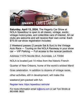 Saturday, April 13, 2024, The Hagerty Car Show at NOLA Speedtour is open to all classic, vintage, exotic, vintage motorcycles, and collectible cars of interest. All car clubs are welcome and will receive their own corral. Each $75.00 car show registration includes: 2 Weekend passes (2 people Sat & Sun) to the Vintage Auto Race -– Touring on the NOLA Raceway in your show car –- VIP Parking — Full access to the racecar paddock. Address:11075 Nicolle Blvd, Avondale, LA 70094 NOLA is located just 14 miles from the historic French Quarter of New Orleans, home of the world’s wildest Mardi Gras celebration. In addition to dozens of vintage races, other activities, still in development, will make this weekend jam-packed with fun. Register here: https://speedtour.net/nola/ For more information email tc@svra.com or call Toni Strollo at 863-698- 8620
