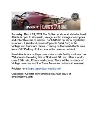 Saturday, March 23, 2024 The SVRA car show at Michelin Road Atlanta is open to all classic, vintage, exotic, vintage motorcycles, and collectible cars of interest. Each $45.00 car show registration includes: – 2 Weekend passes (2 people Sat & Sun) to the Vintage and Trans Am Races – Touring on the Road Atlanta race track – VIP Parking – Full access to the race car paddock Road Atlanta is a multi-purpose motor sports facility is situated on 750 acres in the rolling hills of Northeast GA, and offers a world- class 2.54- mile, 12-turn road course. There will be hundreds of Vintage race cars and the Trans Am series on track all weekend. Register here: https://speedtour.net/atlanta/ Questions? Contact Toni Strollo at 863-698- 8620 or emailtc@svra.com